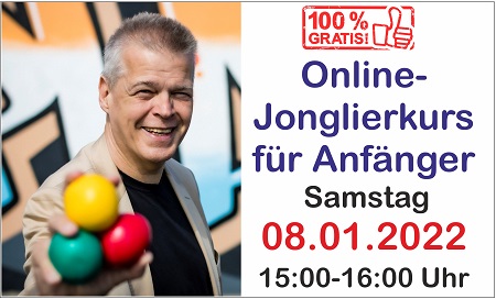 (lifepr) (München, 06.01.2022) "Das Schöne beim Jonglieren ist, dass es keine Verlierer gibt, weil man sich selbst herausfordert", sagt Stephan Ehlers, Inhaber der Jonglierschule München und der Online-Akademie Jonglieren. Das Gehirn bekommt über den Körper (Werfen und Fangen der Bälle) neue Signale in die emotionalen Zentren übertragen. Die ureigene „Verbindung“ zwischen Gehirn und Körper wird dadurch aktiviert. So werden u.a. auch belastende Gedankengänge unterbrochen. Sicher werden dadurch die Probleme nicht verschwinden, aber über das Jonglieren-Lernen kann sich die eigene Haltung dazu verändern. Sowohl Wurf- und Fangübungen mit 1 und 2 Bällen als auch das Jonglieren lernen mit drei oder vier Bällen sind wirksam für Entspannung, Abwechslung und sorgen für neue Energie. In dieser und nächster Woche bietet Stephan Ehlers KOSTENFFREIE ONLINE-WORKSHOPS für das Werfen und Fangen mit 1 und 2 Bällen, aber auch für 3 Bälle und 4 Bälle an: