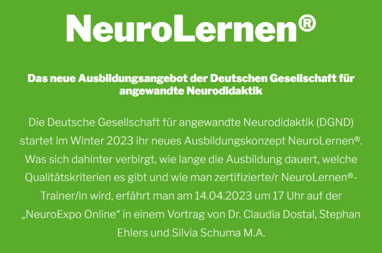 Die Deutsche Gesellschaft für angewandte Neurodidaktik e.V. - DGND startet im Winter 2023 ihr neues Ausbildungskonzept NeuroLernen®. Was sich dahinter verbirgt, wie lange die Ausbildung dauert, welche Qualitätskriterien es gibt und wie man zertifizierte/r NeuroLernen®-Trainer/in werden kann, erfährt man am 14.04.2023 um 17 Uhr auf der NeuroExpo Online.