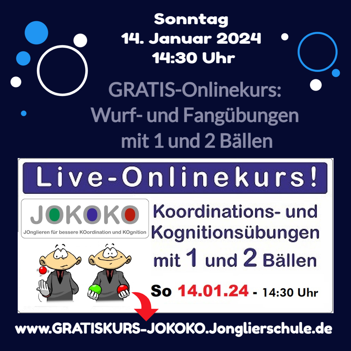 Gleich danach - also auch am Sonntag, 14. Januar - um 16:00 Uhr, bekommt man von Stephan Ehlers, Deutschlands erfolgreichstem Jongliertrainer eine Einweisung in die Kunst der Dreiball-Jonglage. Nach dem Kurs kann man allein weiterüben... dazu gibt es hinterher für alle Teilnehmer Hinweise und Links zu kostenfreien Video-Tools und Lern-Apps. Die Teilnahme an diesem Online-Workshop ist ebenfalls KOSTENFREI! >> https://Gratis-Onlinekurs.Jonglierschule.de