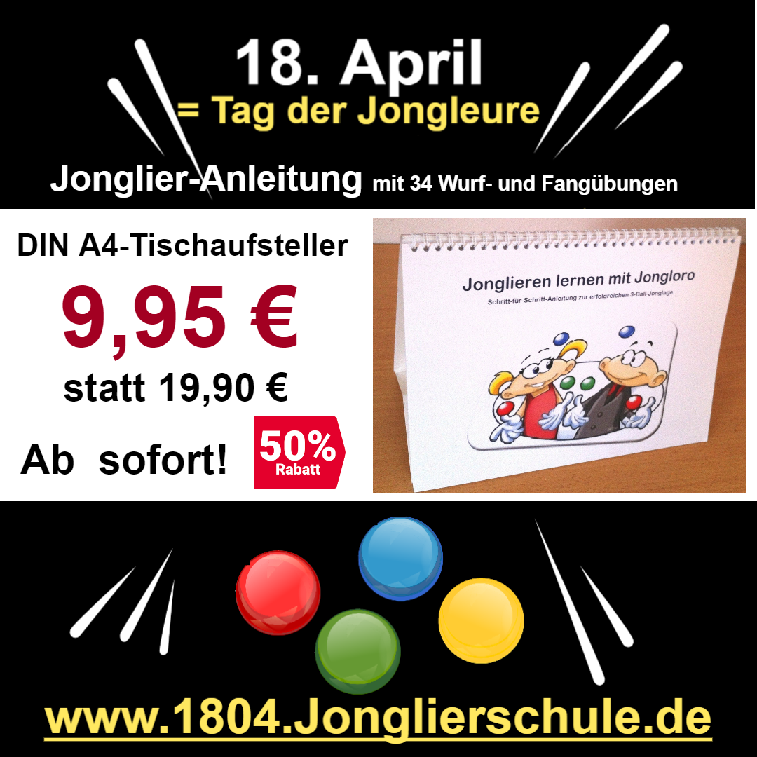 Diese Broschüre (DIN A6 - 36 Seiten) ist Deutschlands meistverkaufte Jonglier-Anleitung. Damit können insbesondere absolute Jonglier-Anfänger Schritt für Schritt mit 34 Übungen das Jonglieren mit drei Bällen in verblüffend kurzer Zeit lernen. Erhältlich in zehn Sprachen. Die Lieferung erfolgt zudem versandkostenfrei!