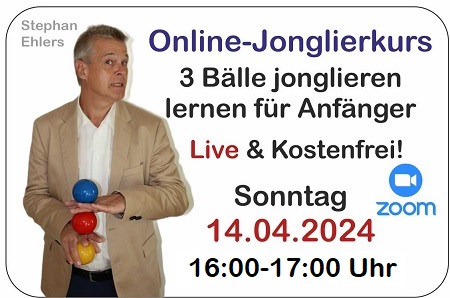 Ein weiterer Onlinekurs mit Stephan Ehlers, Deutschlands erfolgreichstem Jongliertrainer, bei dem Sie Schritt für Schritt das Werfen und Fangen mit 3 Bällen lernen. Nach dem Kurs kann man allein weiterüben... dazu gibt es Hinweise und Links zu kostenfreien Video-Tools und Lern-Apps.