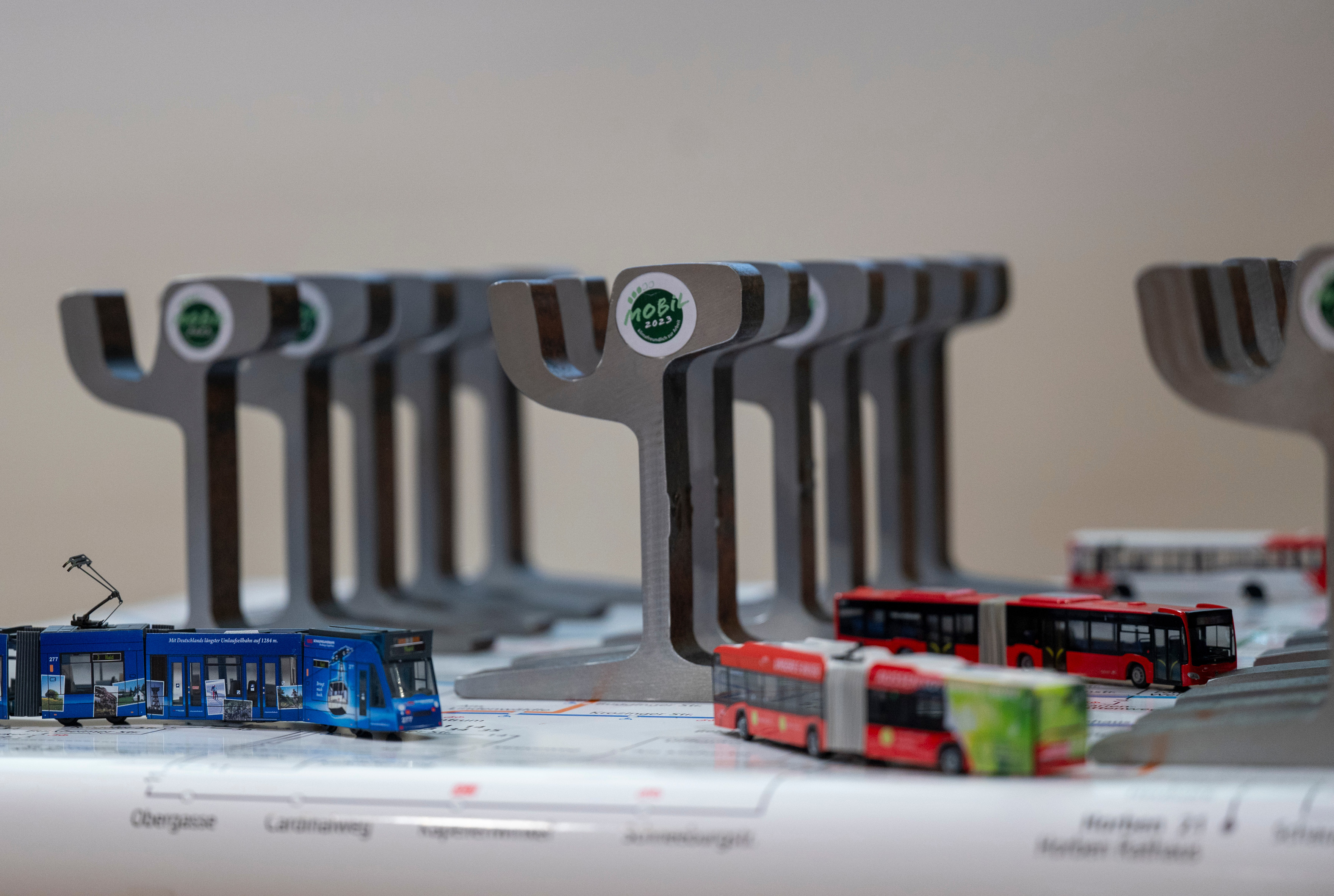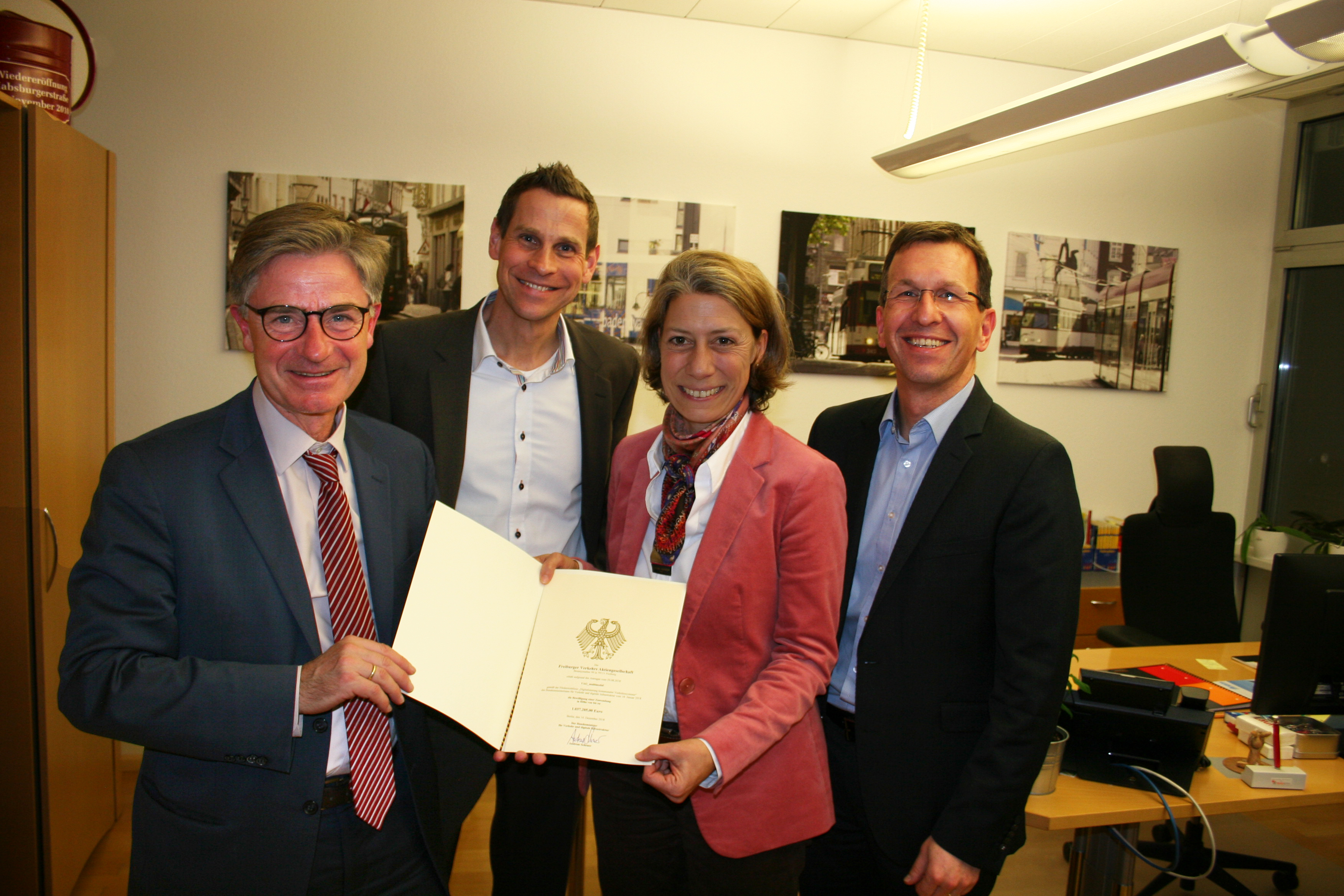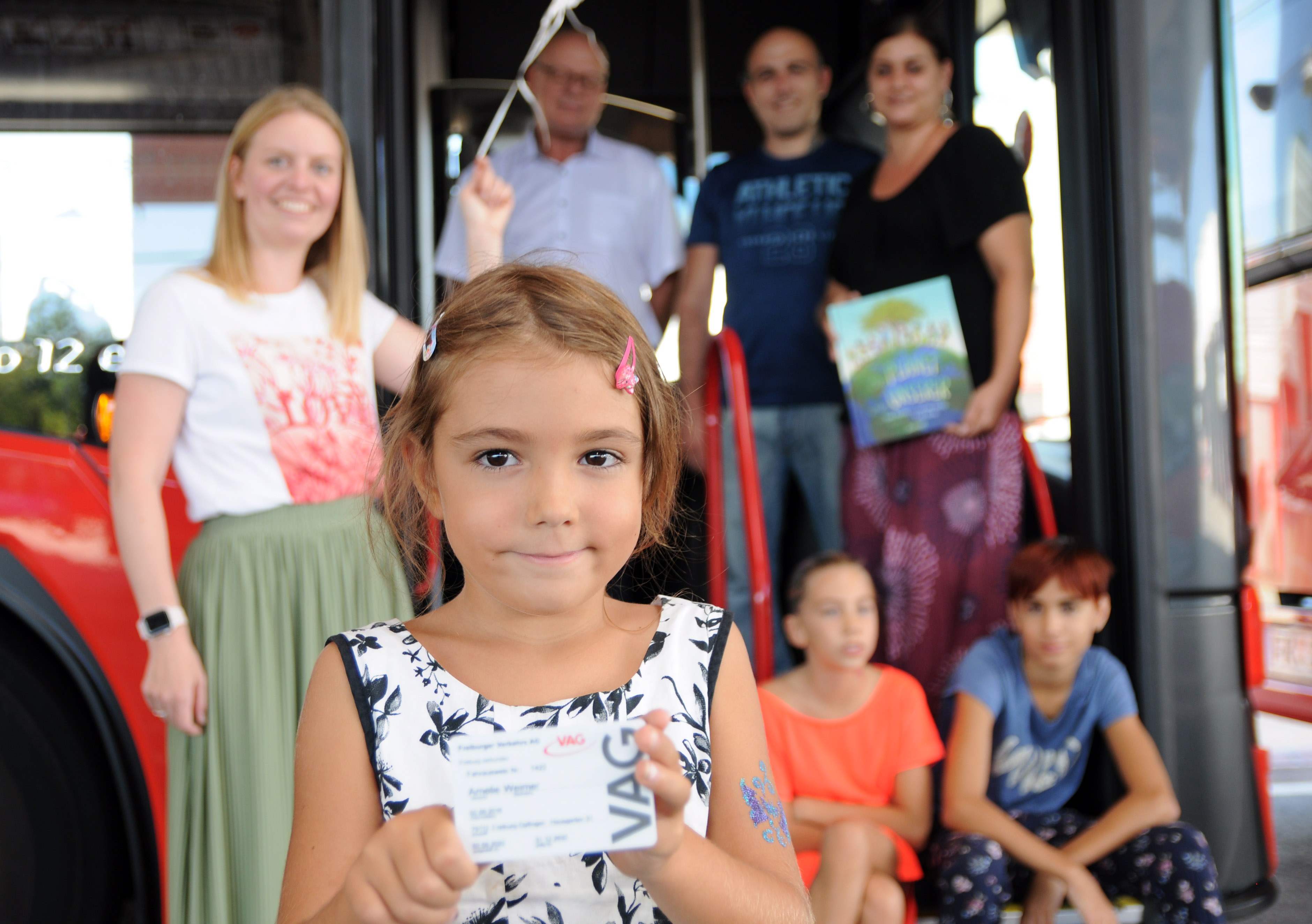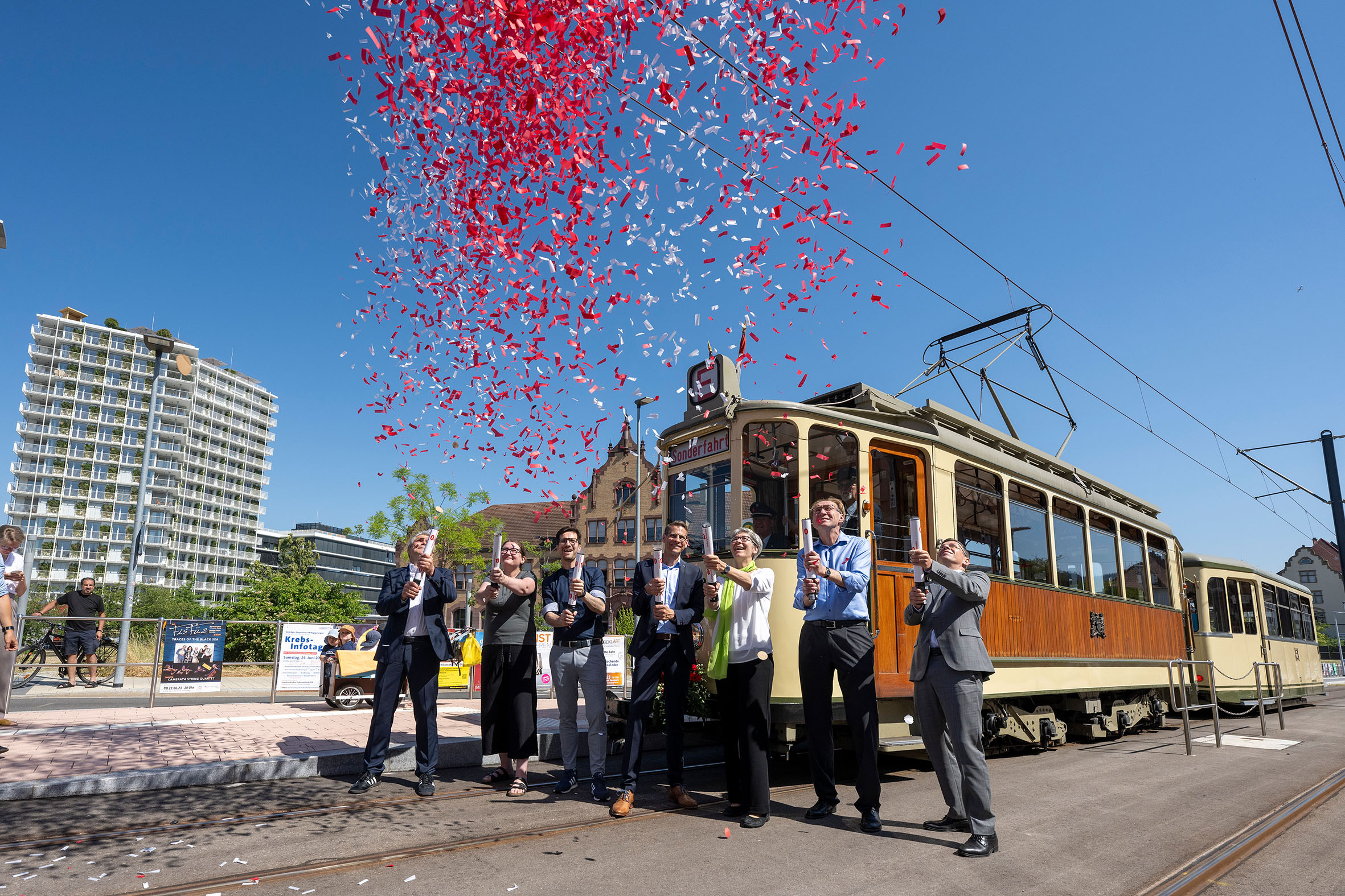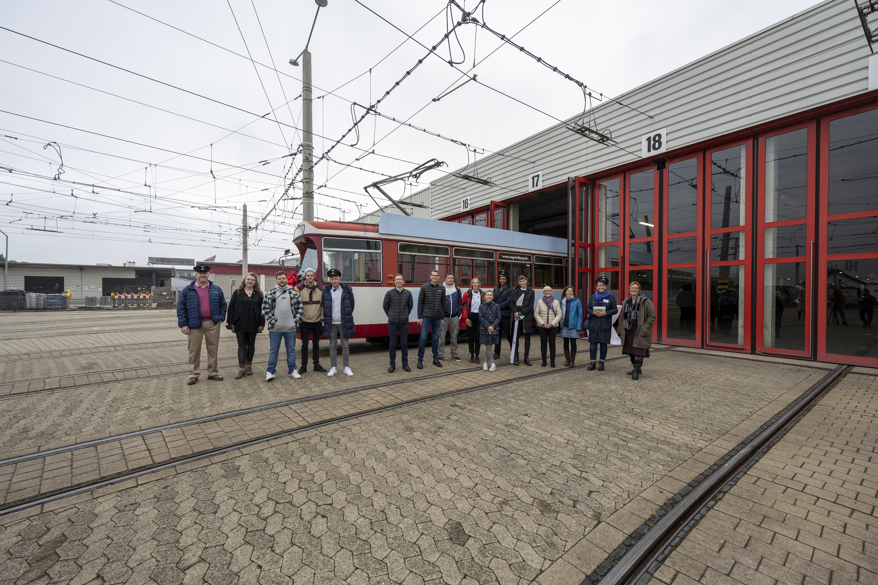 Von links: Oberbürgermeister Martin Horn, Evelin Braun (duale Studentin BWL, VAG), Oliver Benz (Vorstand VAG), Christoph Erdmenger (Leitung Abteilung Nachhaltige Mobilität, Landesverkehrsministerium BW), Michael Zausch (Leitung Unternehmensbereich Werkstätten und Fahrzeugtechnik, VAG Freiburg), Oliver Hoch (Bereichsleiter Mobilitätstechnologien der NOW GmbH), Merle Vollmer (Praktikantin Kommunikation, VAG), Stephan Bartosch (Vorstand VAG)