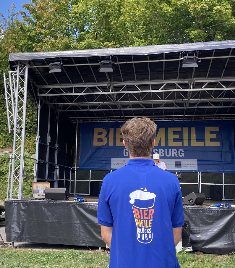 Crewmitglied Tourist-Information Glücksburg vor Bühne Biermeile 2025 bei Auftritt Alexandra Brüntrup