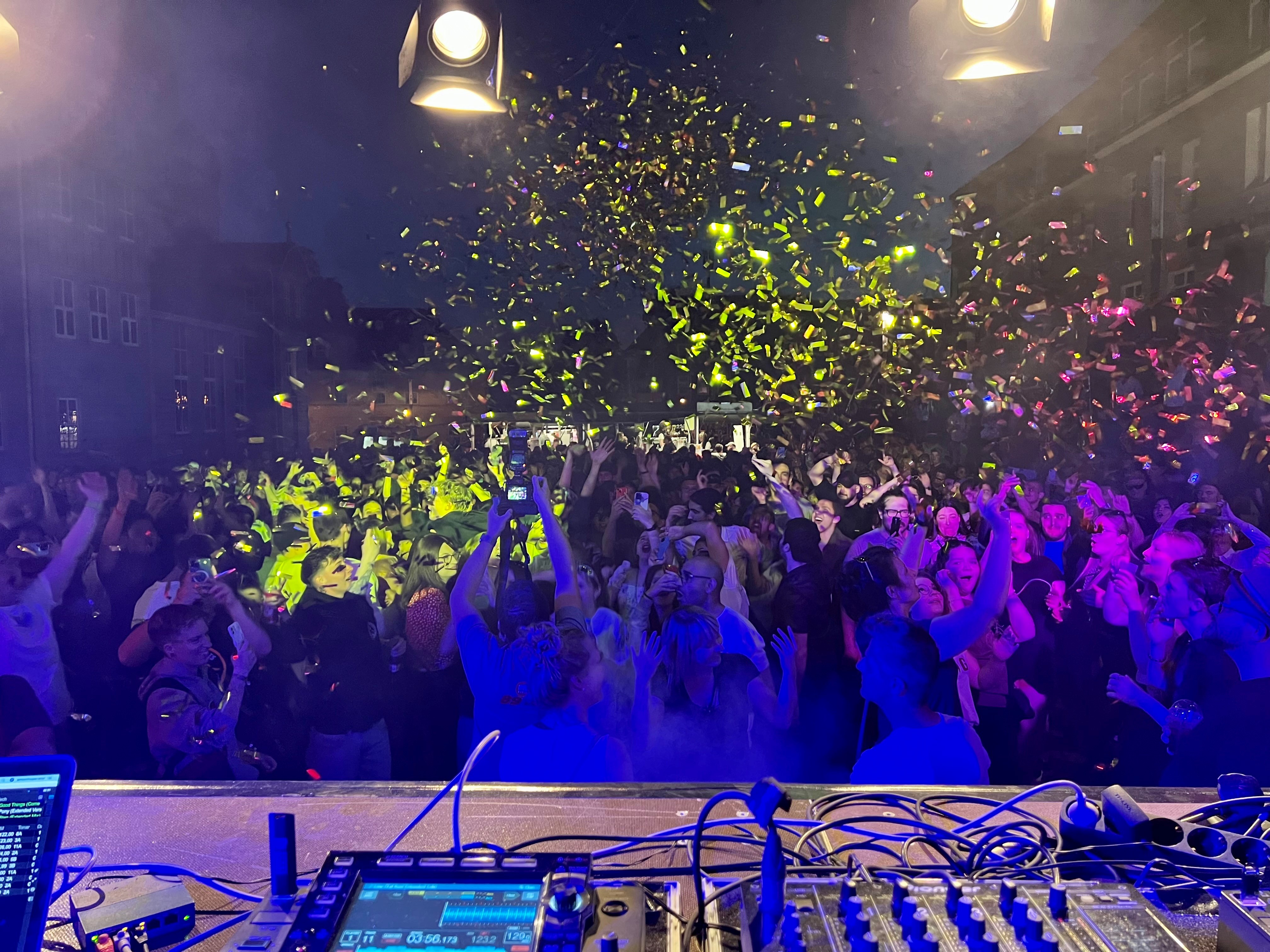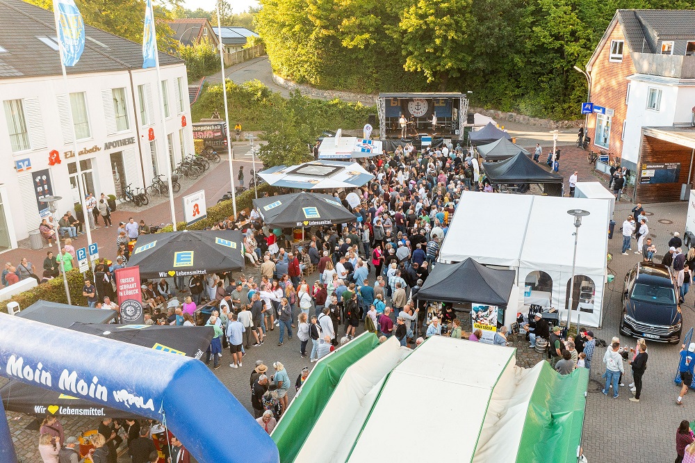 Blick von oben auf das Stadtfest "Biermeile Glücksburg" mit Ständen und Menschen