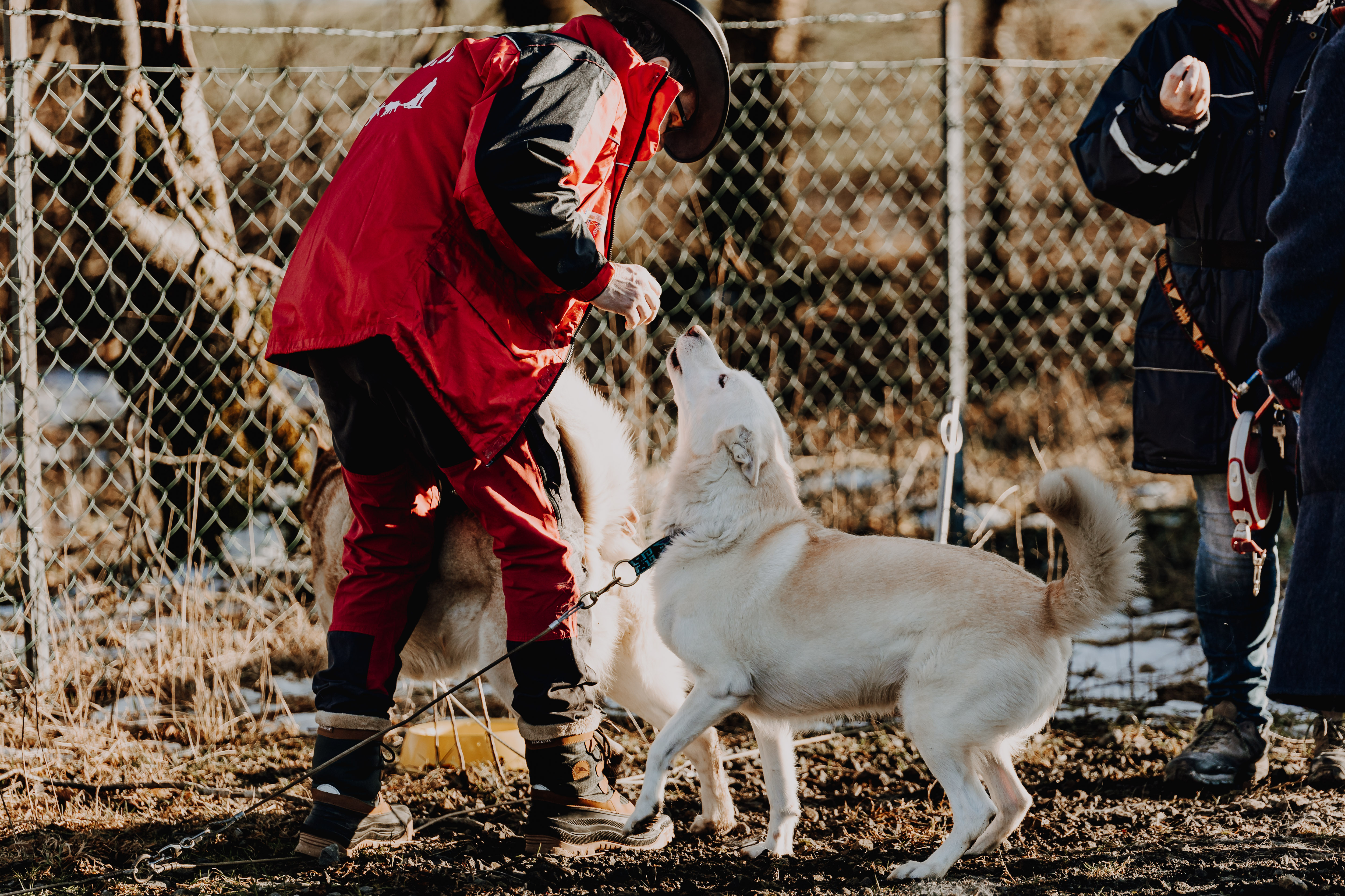 Musher mit Schlittenhunden im Musher-Camp in Clausthal-Zellerfeld beim Oberharzer Schlittenhunde Adventure