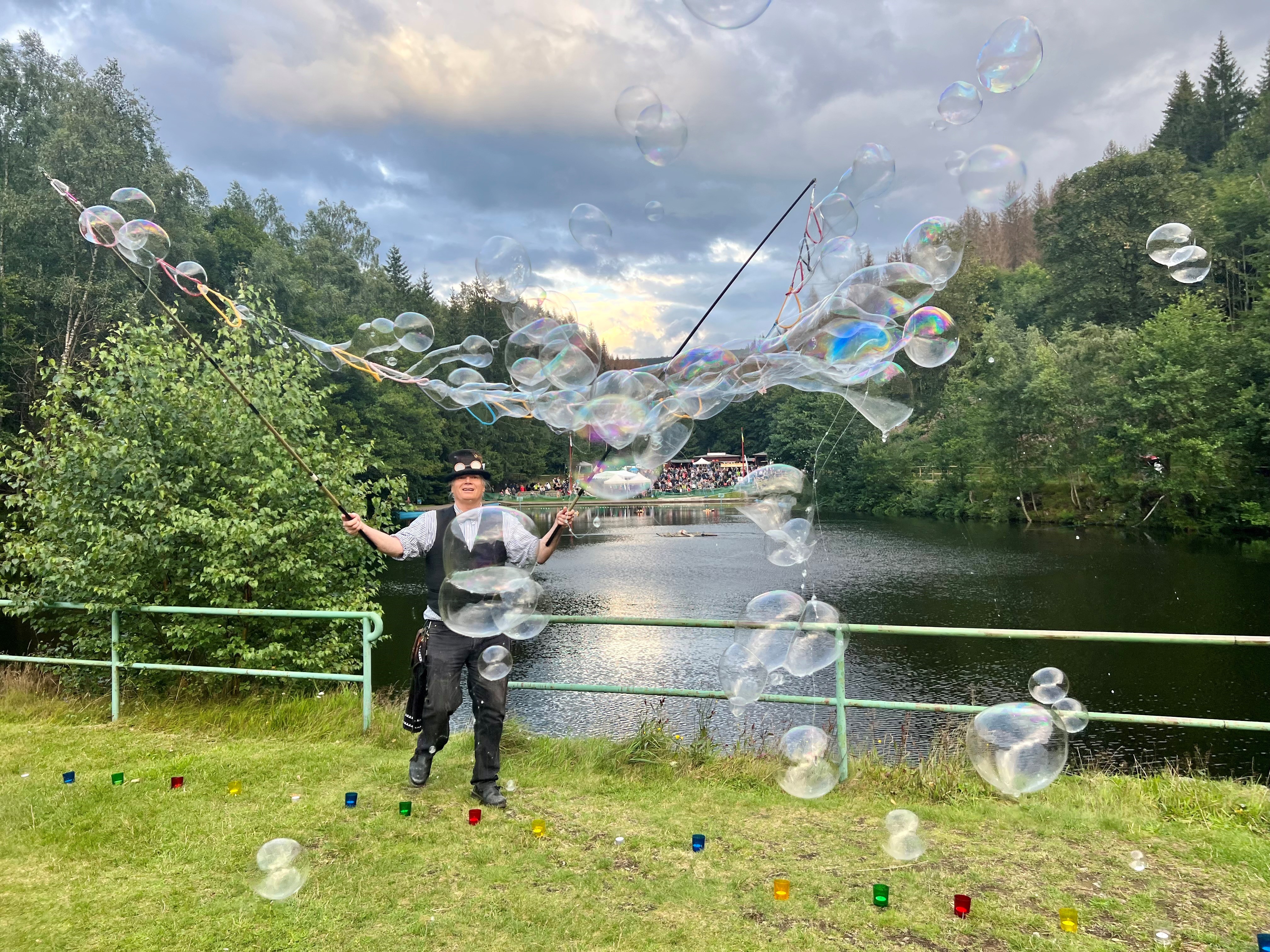 Luftballon- und Seifenblasenkünstler Jost Naumann beim Lichterfest in Altenau am Okerteich