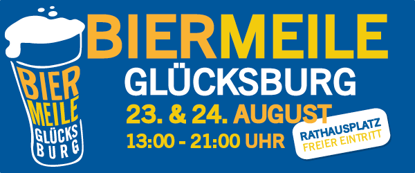 Banner der "Biermeile Glücksburg" mit Informationen zum Event mit blauem Hintergrund mit Schriften in Orange, Gelb, Blau und Weiß