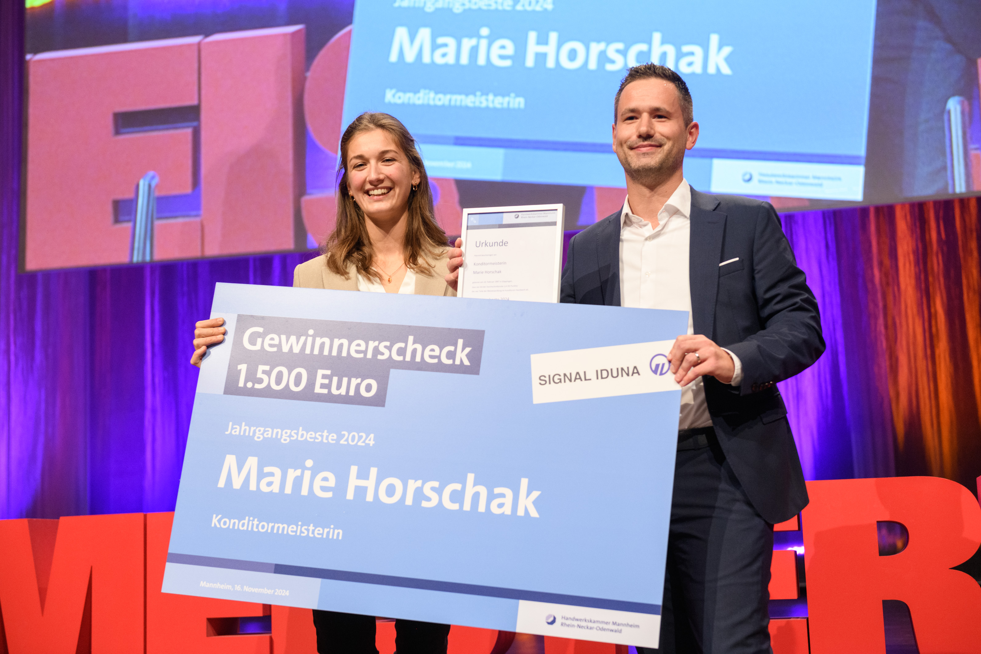 Die Gesamtbeste des Meisterjahrgangs 2024 kam aus Kiel nach Mannheim und hatte sich die mit 1.500 Euro verbundene Auszeichnung der Signal Iduna Gruppe mit Bestleistungen verdient. Timo Gindner, Gebietsdirektor der Signal Iduna, überreichte den Scheck an Konditormeisterin Marie Horschak, die in der Summe aller vier Prüfungsteile auf „herausragende“ 368 von insgesamt 400 möglichen Punkten kam. Dabei betrug der Durchschnitt der vier Teile der Meisterprüfung 92 Punkte, was – umgerechnet in Schulnoten – einer 1,4 entspricht. „Besonders beeindruckend ist dabei, dass Sie im fachpraktischen Teil I unglaubliche 97 Punkte und im fachtheoretischen Teil II beeindruckende 95 Punkte erzielt haben“, berichtete Timo Gindner. „Das spricht für eine ausgezeichnete Fachkompetenz.“ Ohnehin scheine Marie Horschak für das Konditoren-Handwerk geboren zu sein. Nach einem Schülerpraktikum in einer Konditorei, der Fachhochschulreife und einem FSJ in München, startete sie in einem Café in Göppingen ihre Ausbildung zur Konditorin. Während der Ausbildung ging die junge Frau für ein Praktikum nach England, um ihren Wissensdurst zu stillen. Nach der Lehre folgten Zwischenstationen in verschiedenen Cafés, ehe sich Marie Horschak 2024 für die Meisterausbildung entschloss, was Timo Gindner zum Fazit führte, dass geballtes Wissen aus der Praxis die Prüfungen zum Meister mit Bravour bestehen lässt: „Ein gutes Beispiel, dass sich die Erfahrung aus der Praxis auch in den Noten der Prüfungsergebnisse wiederfindet“, sagte er.