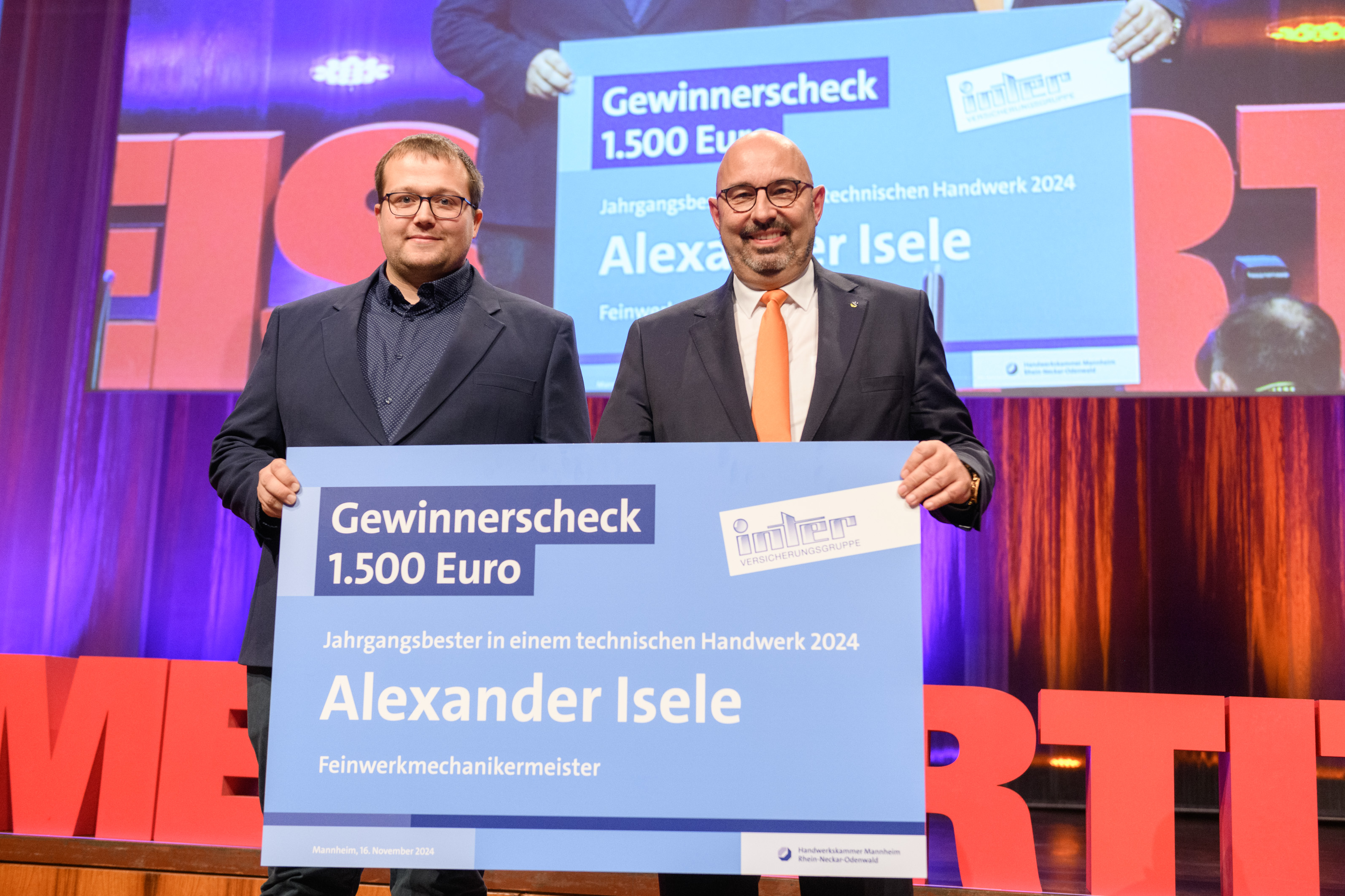 Den ebenfalls mit 1.500 Euro dotierten Preis als Jahrgangsbester in einem technischen Handwerk erhielt Feinwerkmechanikermeister Alexander Isele aus Walldürn von der Inter Versicherungsgruppe. „Die Prüfungen in innovativen und technischen Berufen sind immens“, sagte Vertriebsvorstand Michael Schillinger. „Neben fundierten mathematischen und technischen Kenntnissen sind ein präziser Umgang mit Werkzeugen, Maschinen und Materialien unabdingbar, um den komplexen Wünschen der Kunden gerecht zu werden.“ Mit Alexander Isele zeichne man in diesem Jahr einen Feinwerkmechanikermeister aus, der in seinen Prüfungen außergewöhnliches Können und große Leidenschaft für sein Handwerk gezeigt habe. Besonders in den fachbezogenen Prüfungsteilen I und II beeindruckte er mit 96 beziehungsweise 94 von 100 möglichen Punkten. Insgesamt erreichte der Jungmeister die Note 1,5 und gehört zu den Top-3 des Jahrgangs 2024. „Das Feinwerkmechaniker-Handwerk ist heute essenziell, da es durch präzise, innovative und spezialisierte Arbeit die Anforderungen zahlreicher Hightech-Branchen erfüllt und gleichzeitig zur Nachhaltigkeit sowie zur Wirtschaft durch maßgeschneiderte Lösungen beiträgt“, sagte Michael Schillinger. „Alexander Isele verkörpert genau diesen anspruchsvollen Standard an Qualität und Kompetenz.“