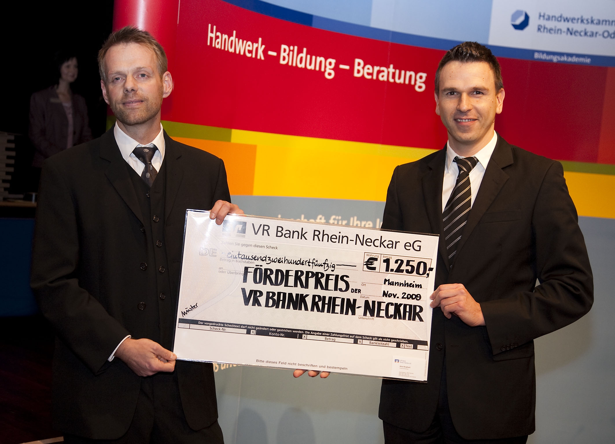 Artur Burghard, Bevollmächtigter der VR-Bank Rhein-Neckar e.G., überreichte im Rahmen der Großen Meisterfeier 2009 der Handwerkskammer Mannheim Rhein-Neckar-Odenwald einen "Start-Up"-Scheck in Höhe von 1.250 Euro an einen jungen Selbstständigen, der in die Handwerksrolle der Handwerkskammer Mannheim als Einzelunternehmer eingetragen sei. Damit habe Achim Dinger vorbildlich gehandelt.