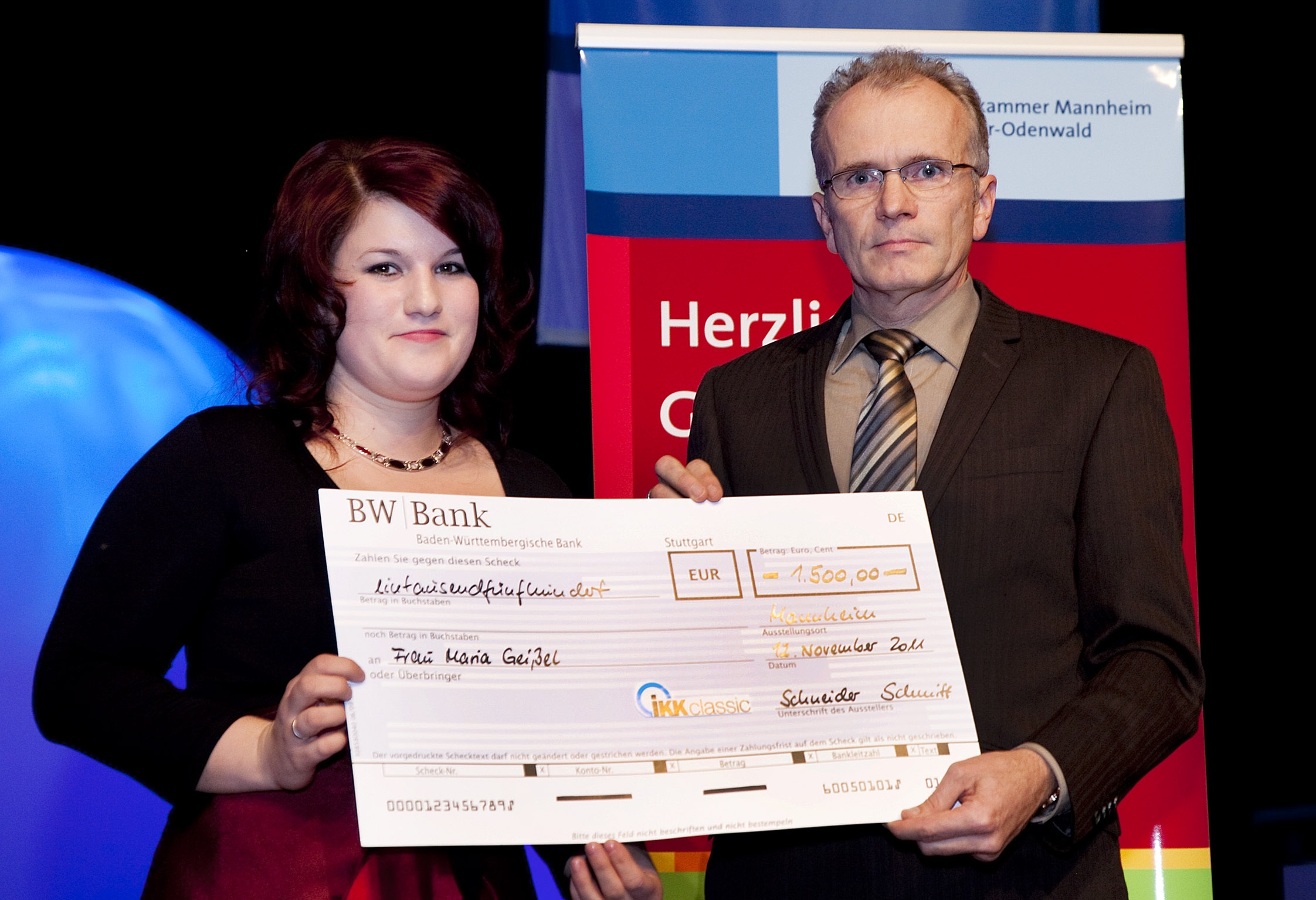 Der stellvertretende Geschäftsführer der Regionaldirektion Rhein-Neckar der IKK classic, Roland Schmitt, gratulierte der Jungmeisterin zu diesem Erfolg und überreichte ihr in Anerkennung ihrer Leistungen den Scheck in Höhe von 1.500 Euro.