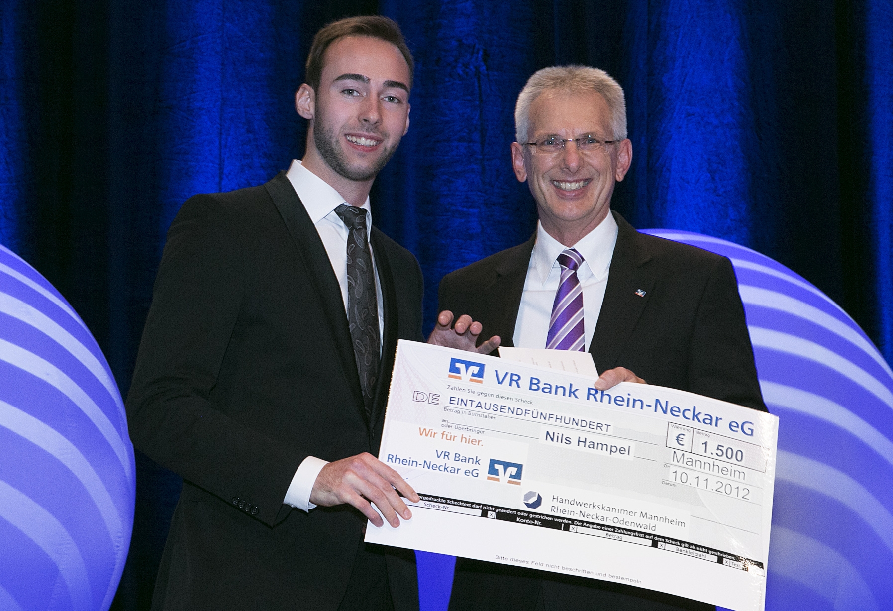 Peter Anderer, Bereichsleiter Gewerbekundenberater der VR-Bank Rhein-Neckar e.G., überreichte im Rahmen der Großen Meisterfeier 2012 der Handwerkskammer Mannheim Rhein-Neckar-Odenwald einen "Start-Up"-Scheck in Höhe von 1.500 Euro an den jungen 22jährigen, der sich zusammen mit einem Kollegen, der im letzten Jahr die Meisterprüfung erfolgreich abgelegt hatte, in diesem Jahr selbstständig gemacht hat. "Wer am 4. Juli 2012 seine Meisterprüfung erfolgreich besteht und sich am 9. Juli 2012, also 5 Tage später, in die Handwerksrolle als Selbstständiger eintragen lässt, der handelt vorbildlich", so die Volksbank in ihrer Begründung.