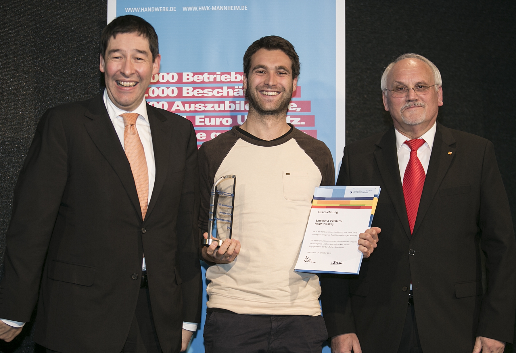 So erhielt Sattler Denis Waskey von der Sattlerei und Polsterei Ralph Waskey aus Heidelberg dieses "äußere Zeichen unseres Dankes". Tschischka wörtlich: "Ihre Ausbildungsleistung verdient hohen Respekt und meine große Hochachtung. Sie geben Ihr Wissen und Können weiter und stehen so in einer guten Tradition des Handwerks".