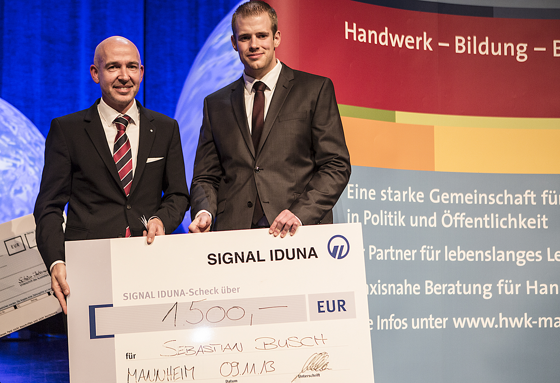 (lifepr) (Mannheim, 11.11.2013) Als Jahresbester von 526 frischgebackenen Jungmeisterinnen und Jungmeistern wurde im Rahmen der Großen Meisterfeier der Handwerkskammer Mannheim Rhein-Neckar-Odenwald Metallbauermeister Sebastian Busch aus Mannheim von der Signal-Iduna Versicherungsgruppe ausgezeichnet. Mit insgesamt 374 von 400 möglichen Punkten und dem Notendurchschnitt von 1,3 - ermittelt aus den Teilnoten der Meisterprüfung - konnte er nicht nur die Meisterprüfungskommission, sondern auch die über 1.800 Gäste im Mozartsaal des Mannheimer Rosengartens überzeugen.
