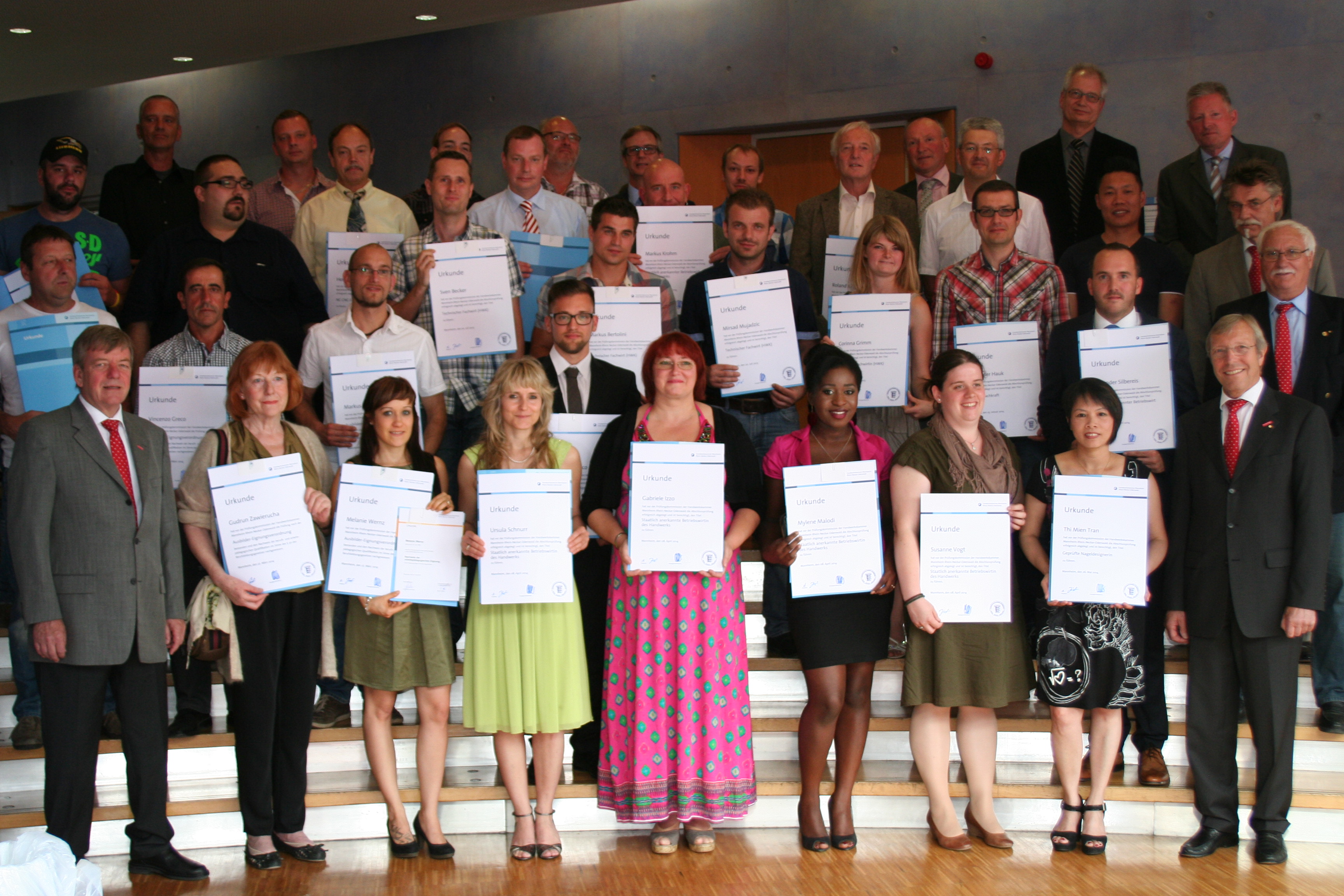 So erhielten die Ausbilder nach der Ausbildereignungsverordnung ebenso ihre Urkunden, wie die Betriebswirte des Handwerks, die frisch gebackenen Gebäudeenergieberater (Hwk) oder Servicetechniker. Neben Nageldesignern, NC-CNC-Fachkräften wurden auch technische Fachwirte aufgerufen.