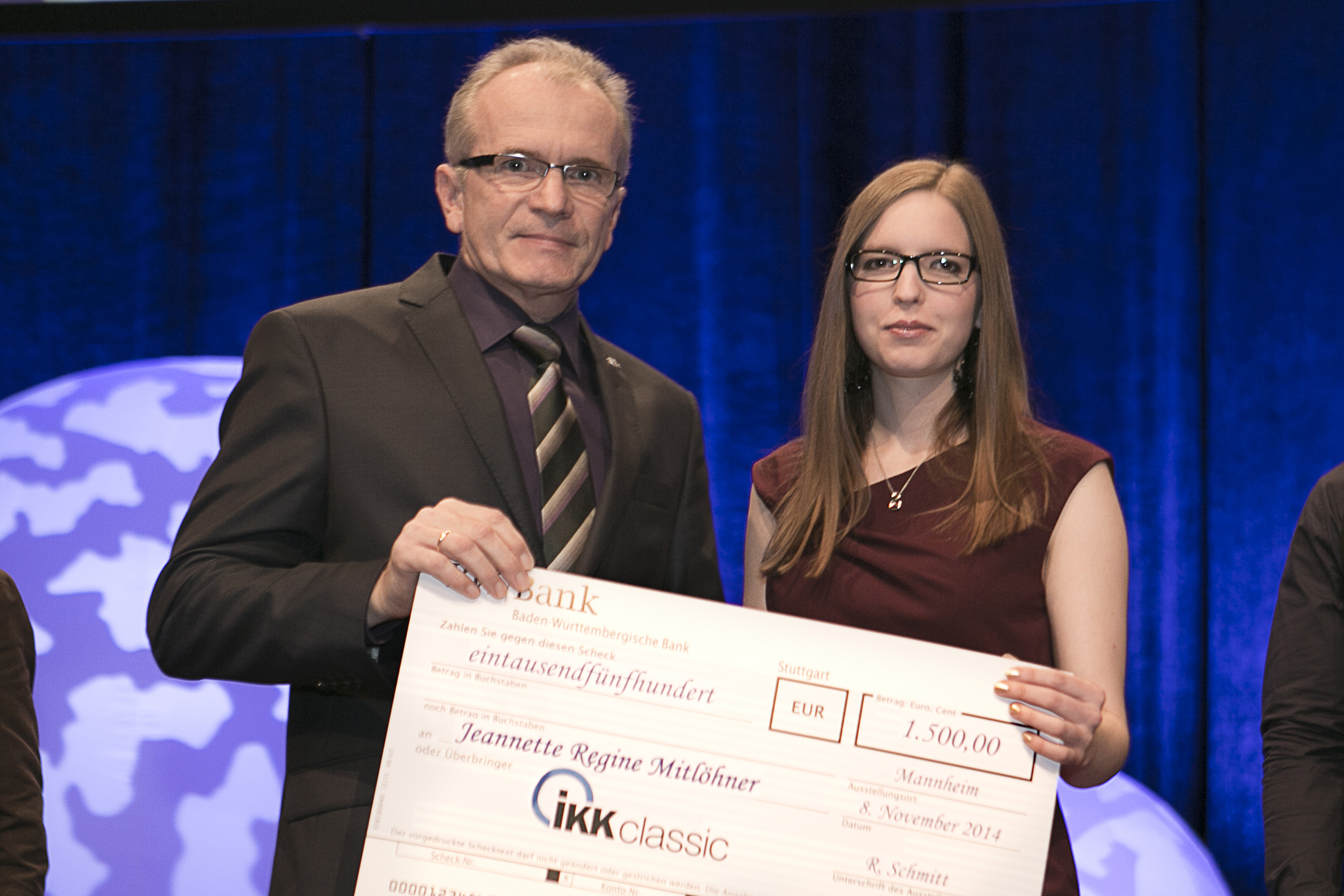 Der Geschäftsführer der Regionaldirektion Rhein-Neckar der IKK classic, Roland Schmitt, gratulierte der Jungmeisterin zu diesem Erfolg und überreichte ihr in Anerkennung ihrer Leistungen den Scheck in Höhe von 1.500 Euro.