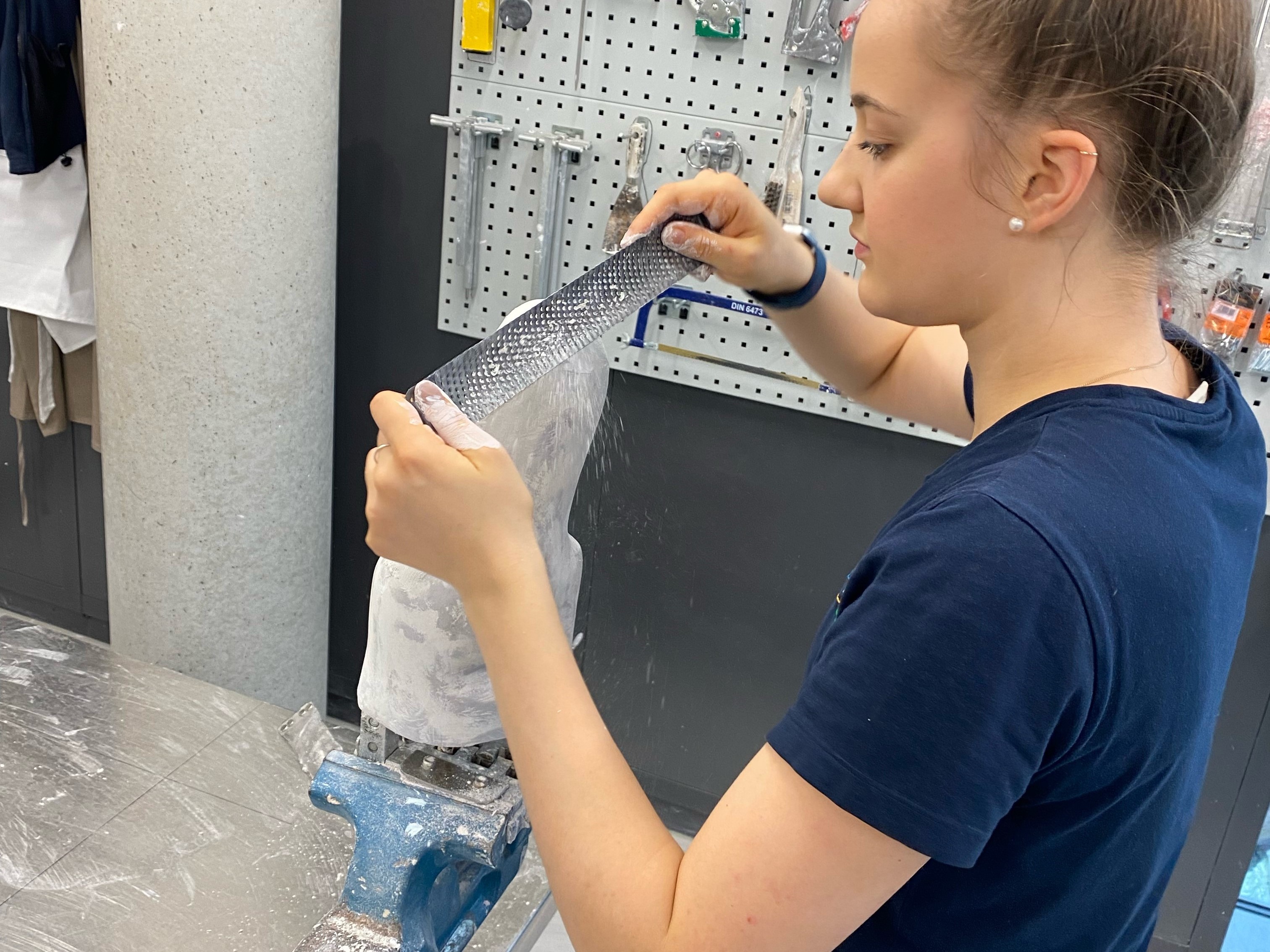„Wenn ich mir die Meister in unserem Betrieb anschaue, dann finde ich einfach erstaunlich, was die alles wissen“, sagt sie voller Anerkennung. Auf einem solchen Weg sieht sie sich auch. Für die 22-Jährige war der Weg in die Ausbildung genau der richtige Schritt. Spätestens in den zwei Unisemestern hat sie gemerkt, dass ein Studium nichts für sie ist. „Meine Eltern wussten das schon früher, sie haben immer geagt, dass ich der Typ für eine Ausbildung bin.“ Trotzdem wollte es Noemi Freitag erst mal anders probieren. Ihre Wahl fiel auf das Studium der angewandten Biomechanik. „Das ist ein Thema, das gar nicht so weit von dem entfernt liegt, was ich jetzt mache“, sagt sie. Ein Unterschied liegt allerdings in der Herangehensweise. Während an der Uni alles steril und theoretisch verläuft, ist in ihrem Ausbildungsbetrieb, Adviva in Heidelberg, das Anpacken gefragt. Und das kommt der jungen Frau entgegen. „Den ganzen Tag am PC sitzen ist wirklich nicht mein Ding“, meint sie. „Ich habe schon als Kind gerne gewerkelt und war immer dabei, wenn mein Vater im Haus etwas repariert hat. Das machte mir einfach Spaß.“ In ihrer Ausbildung zur Orthopädietechnik Mechanikerin bekommt sie beides: auf der einen Seite das Handwerk an sich, auf der anderen all das Wissen über Anatomie.