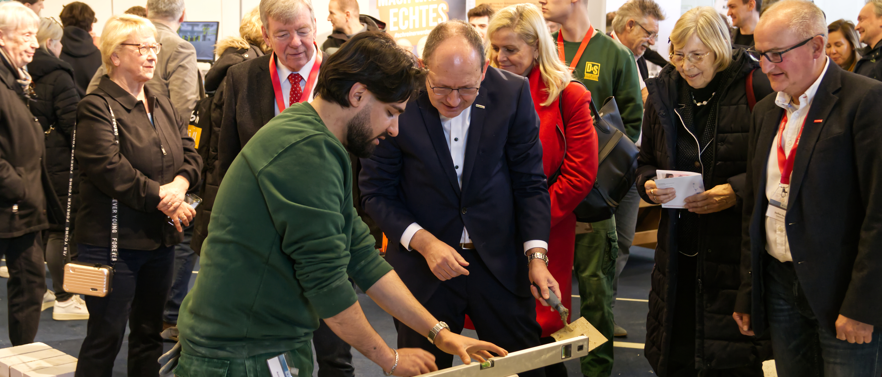 Einen prominenten Gast am Stand gab es gleich zum Messeauftakt am Donnerstag mit dem ersten Bürgermeister der Stadt Mannheim, Christian Specht. Er stellte beim Rundgang über die Aus- und Weiterbildungsmesse sein handwerkliches Talent unter Beweis und setzte – unter Anleitung – mit Mörtel und Kelle ausgestattet einen Stein auf die Mauer, die die Bauberufe zu Anschauungszwecken entstehen ließen. Jeder, der wollte, konnte es ausprobieren. Bei den Maurern genauso wie bei den zwölf anderen Handwerksberufen, die sich auf der Jobs for Future präsentierten. „An keinem anderen Stand der Messe gab es so viele Mitmachaktionen wie beim Handwerk“, so Leonard Kopp.
