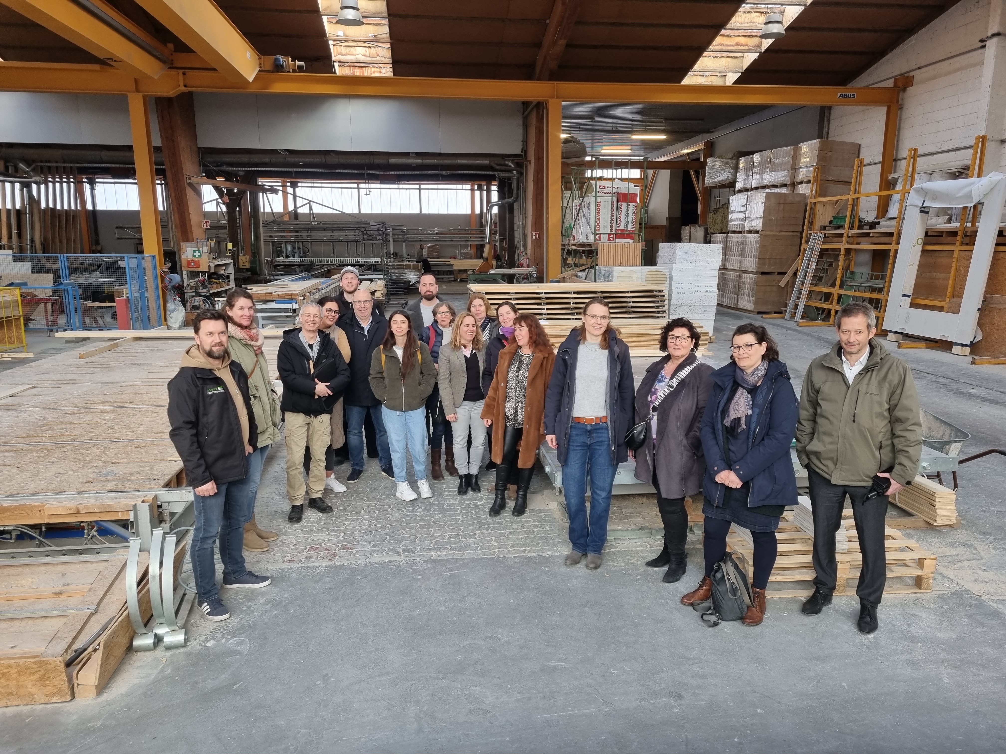 „Elsässer Holzbauwerte“ steht als familiengeführtes Unternehmen, das Tradition mit Moderne verbindet, für nachhaltiges Bauen. Gleich zu Beginn der Ausbildung vermittelt der Betrieb diese Werte seinen Auszubildenden, die sich dem Beruf des Zimmerers stellen. Ein Berufsbild, das die interessierte Besuchergruppe hautnah und in typischer Geräuschkulisse erleben durfte. Insbesondere die Dimensionen der Maschinen mit riesigen Sägeblättern und Bohrern sowie die gefertigten Wandelemente für Holzhäuser beeindruckten die Anwesenden. Die Besucher konnten sowohl den Mitarbeitern live bei der Arbeit zuschauen als auch in direkten Kontakt mit am Nachmittag nicht genutzten Maschinen kommen: Die Maschinen durften betreten werden, wodurch die Ausmaße der Arbeitsgeräte eindrücklich unterstrichen wurde. Speziell für die Techniklehrkräfte war die Veranstaltung dank der technischen Informationen und der Materialkunde ganz nach ihrem Geschmack. Sven Cornelius und Robert Meyer führten die Gruppe durch den Betrieb. Sie brachten ihre Expertise zum Besten und signalisierten im angeregten Austausch Offenheit im Hinblick auf Schulkooperationen und Praktika.