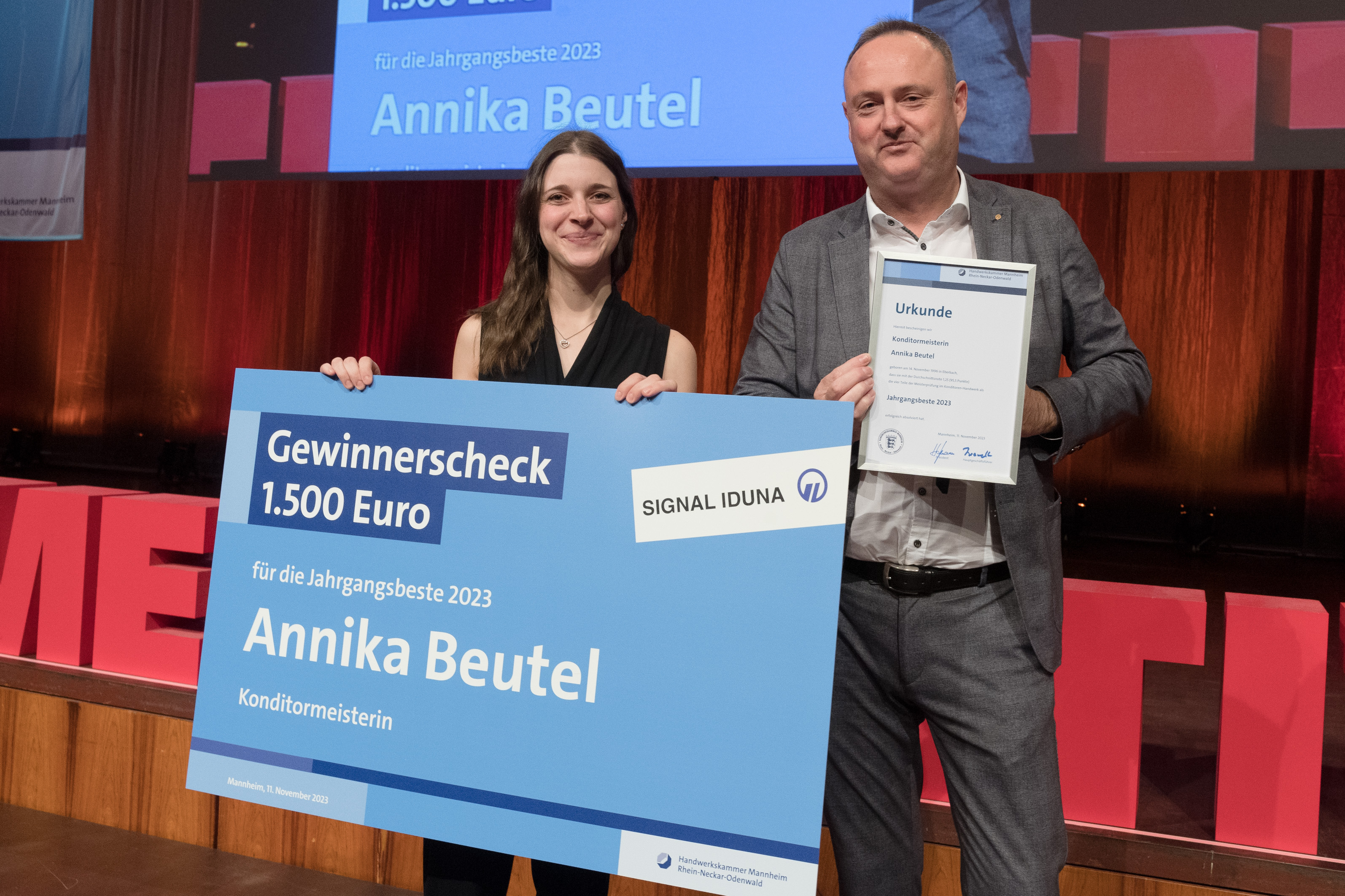 (lifepr) (Mannheim, 14.11.2023) Es gibt Leistungen, die sind einfach herausragend. So gut, dass sie nicht nur eine besondere Erwähnung oder ein Lob, sondern auch einen Preis verdienen. Annika Beutel hat eine solche Leistung erbracht. Sie ist frisch gebackene Konditormeisterin und hat in der Summe der vier erforderlichen Prüfungsteile 382 von insgesamt 400 möglichen Punkten erreicht. „Das ist seit vielen Jahren eine der besten Leistungen im Kammerbezirk der Handwerkskammer Mannheim Rhein-Neckar-Odenwald“, unterstrich Gebietsdirektor Axel Bauer von der SIGNAL IDUNA Gruppe. Der Leiter der Gebietsdirektion Karlsruhe überreichte der Jahrgangsbesten aus dem Prüfungsjahrgang 2023 bei der Meisterfeier am Samstag im Rosengarten einen Scheck in Höhe von 1.500 Euro.