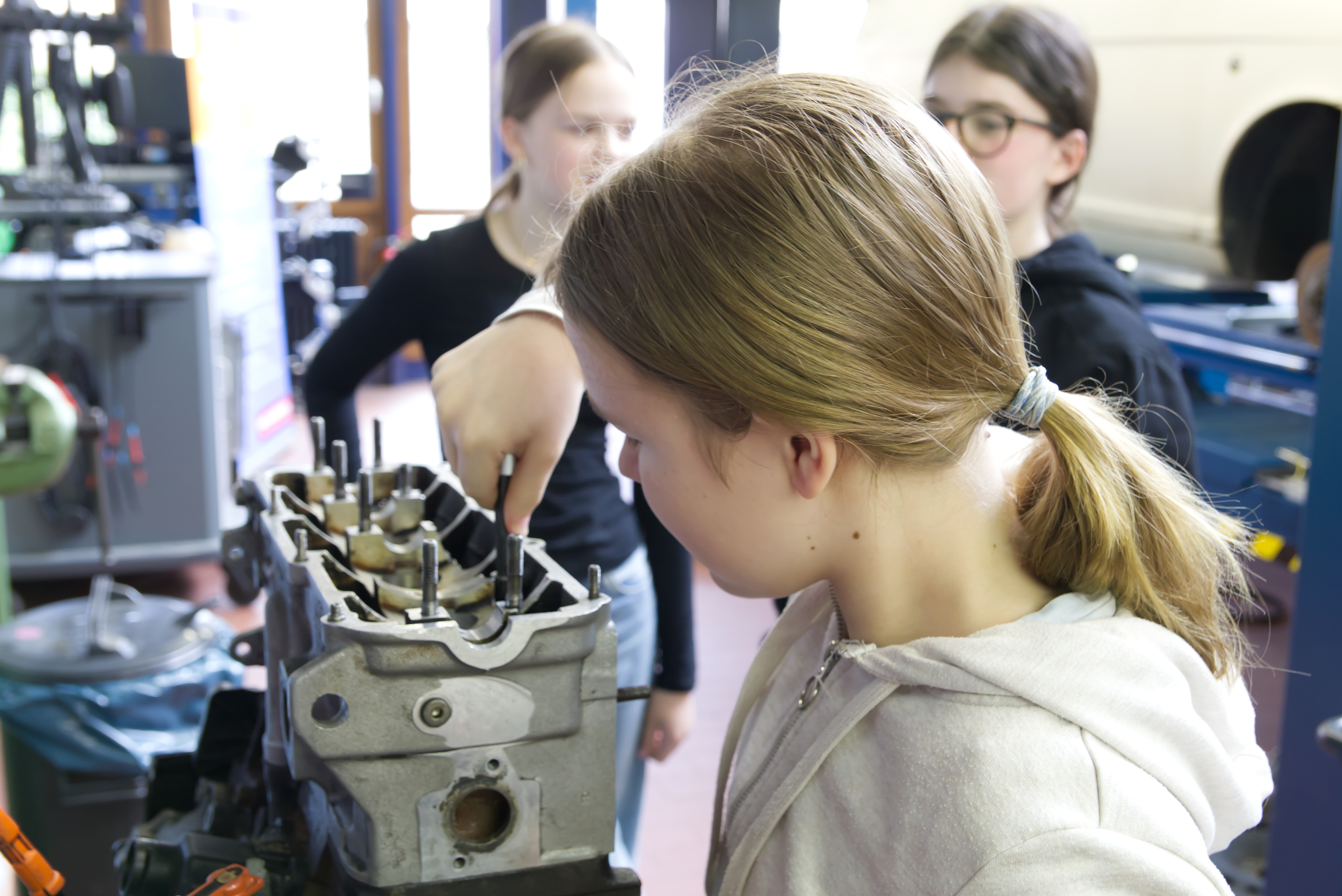 Auch in der Kfz-Werkstatt war dies möglich. Dort erläuterte Ausbilder Michael Schmitt den Beruf des Kfz-Mechatronikers. Allein schon zu spüren, wie ihre Hand angezogen wird, wenn sie sie am Kolben auflegen, sorgte bei den Mädels für ein Aha-Erlebnis. Und die Ausbilder in der Bildungsakademie freuten sich ihrerseits über den interessierten Besuch. „Es begeistert, wenn alle mitmachen. Die Mädchen haben richtig Lust, etwas auszuprobieren“, sagen sie einvernehmlich. Im Gegenzug bekommen die Ausbilder Bestnoten von den Schülerinnen. „Alle hier sind sehr freundlich und nett“, bestätigt Paula Kuhn. Und Eva Piela fügt an: „Die Ausbilder erklären alles, wenn man etwas nicht versteht. Man kann jede Frage stellen.“
