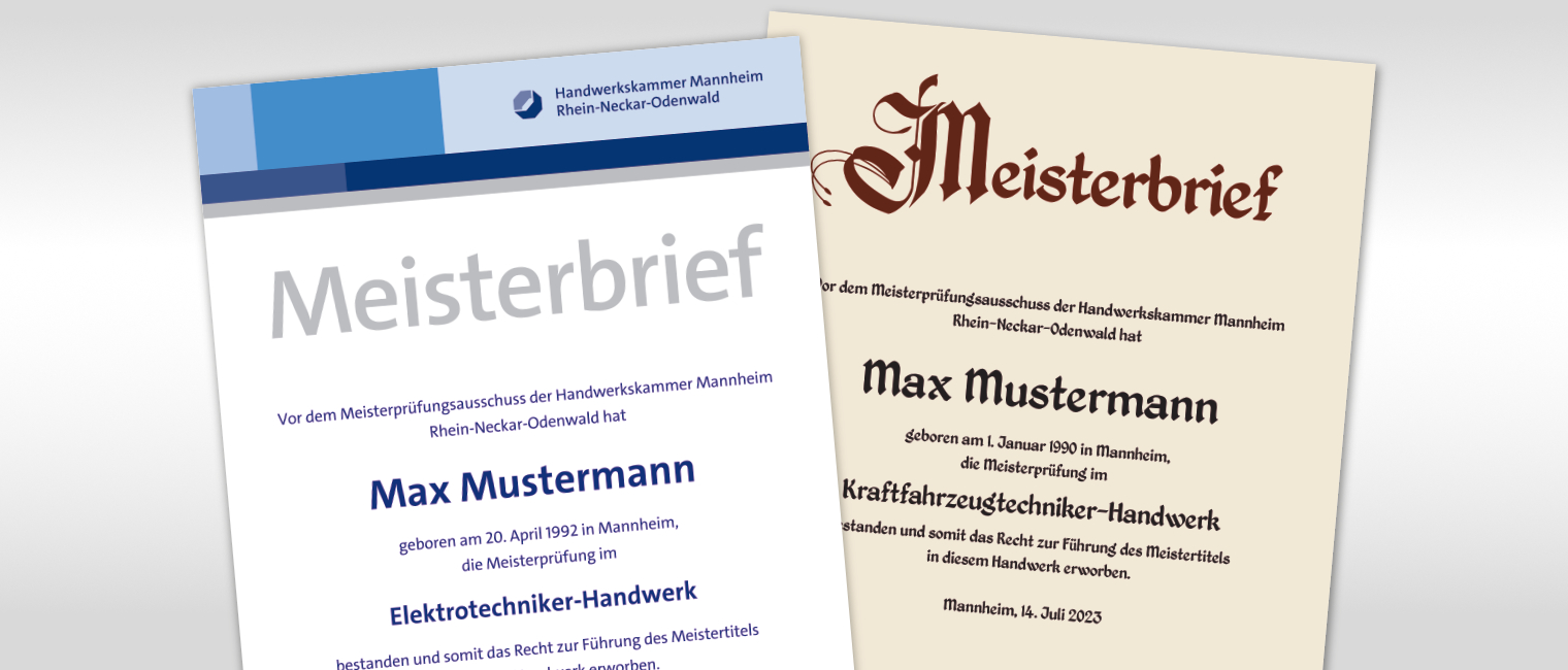 (lifepr) (Mannheim, 09.07.2024) Wer heute von der Handwerkskammer Mannheim Rhein-Neckar-Odenwald seinen Meisterbrief ausgehändigt bekommt, erhält ihn in einem modernen Design: auf weißem Schmuckpapier, bedruckt mit einer schlichten, zeitgemäßen Schrifttype und in den blauen Kammerfarben. Doch es gibt den Meisterbrief auch im traditionellen, etwas verschnörkelteren Look. Erst im vergangenen Jahr hat es die Kammer wieder eingeführt, da Meisterinnen und Meister immer wieder nach einer klassischen Schmuckvariante gefragt hatten. Der traditionelle Meisterbrief kann seither als Zweitschrift bestellt werden.