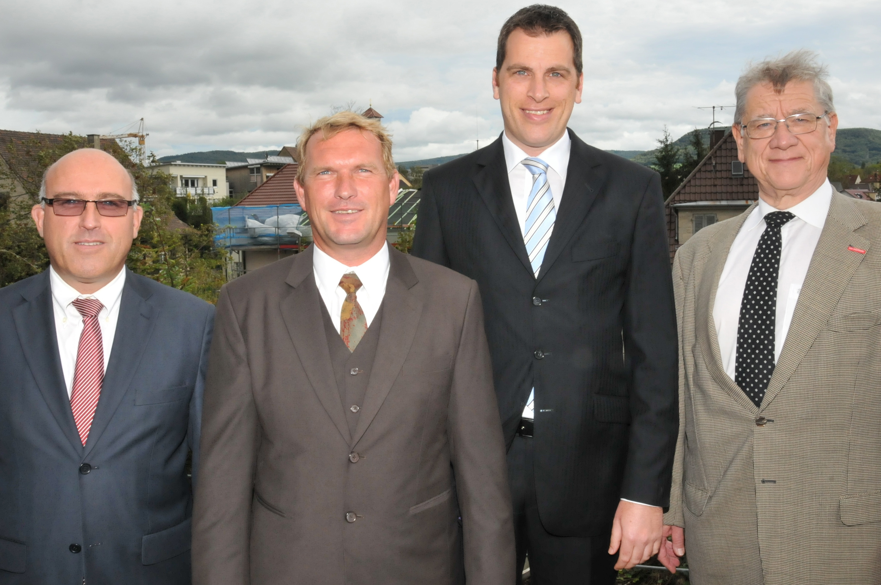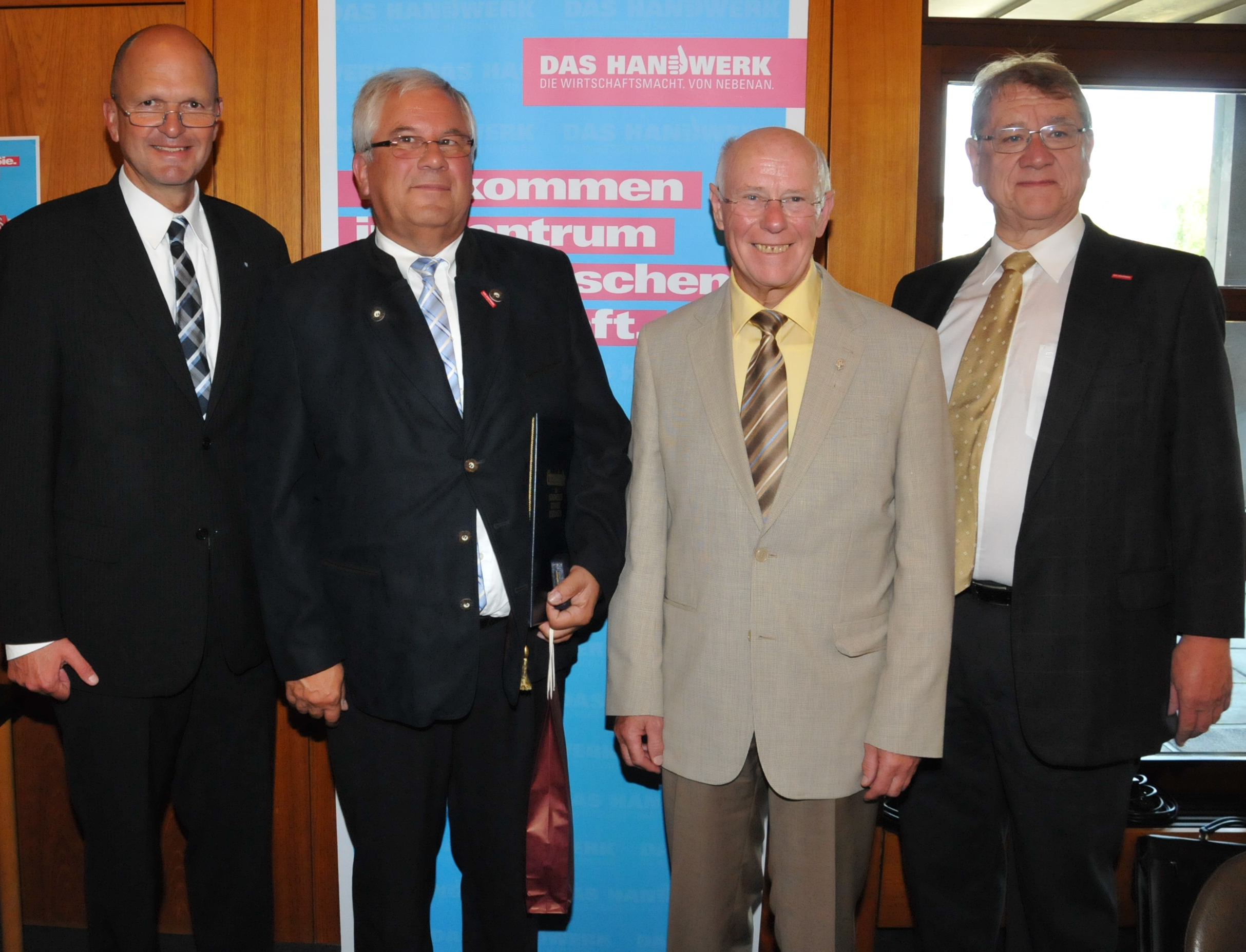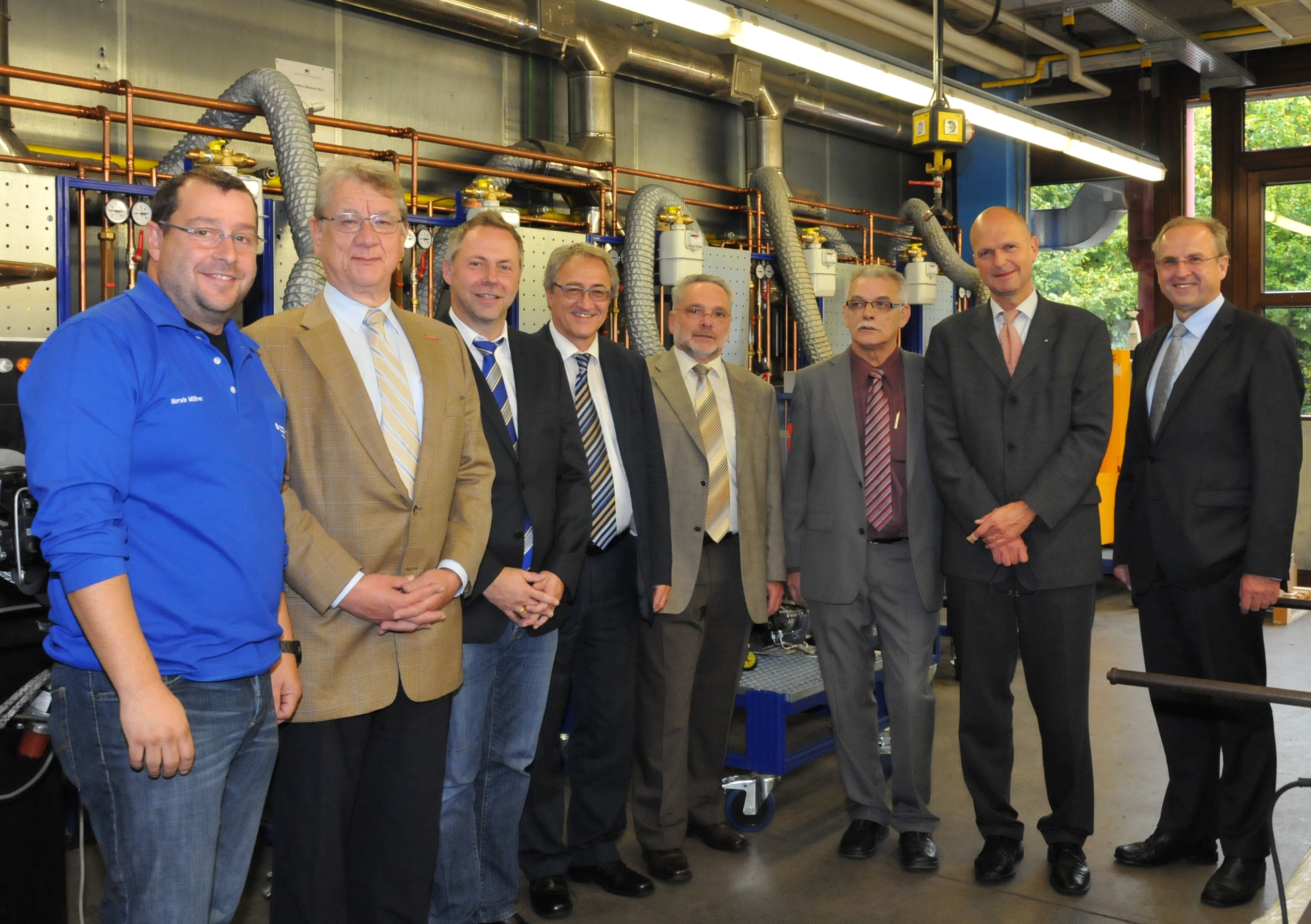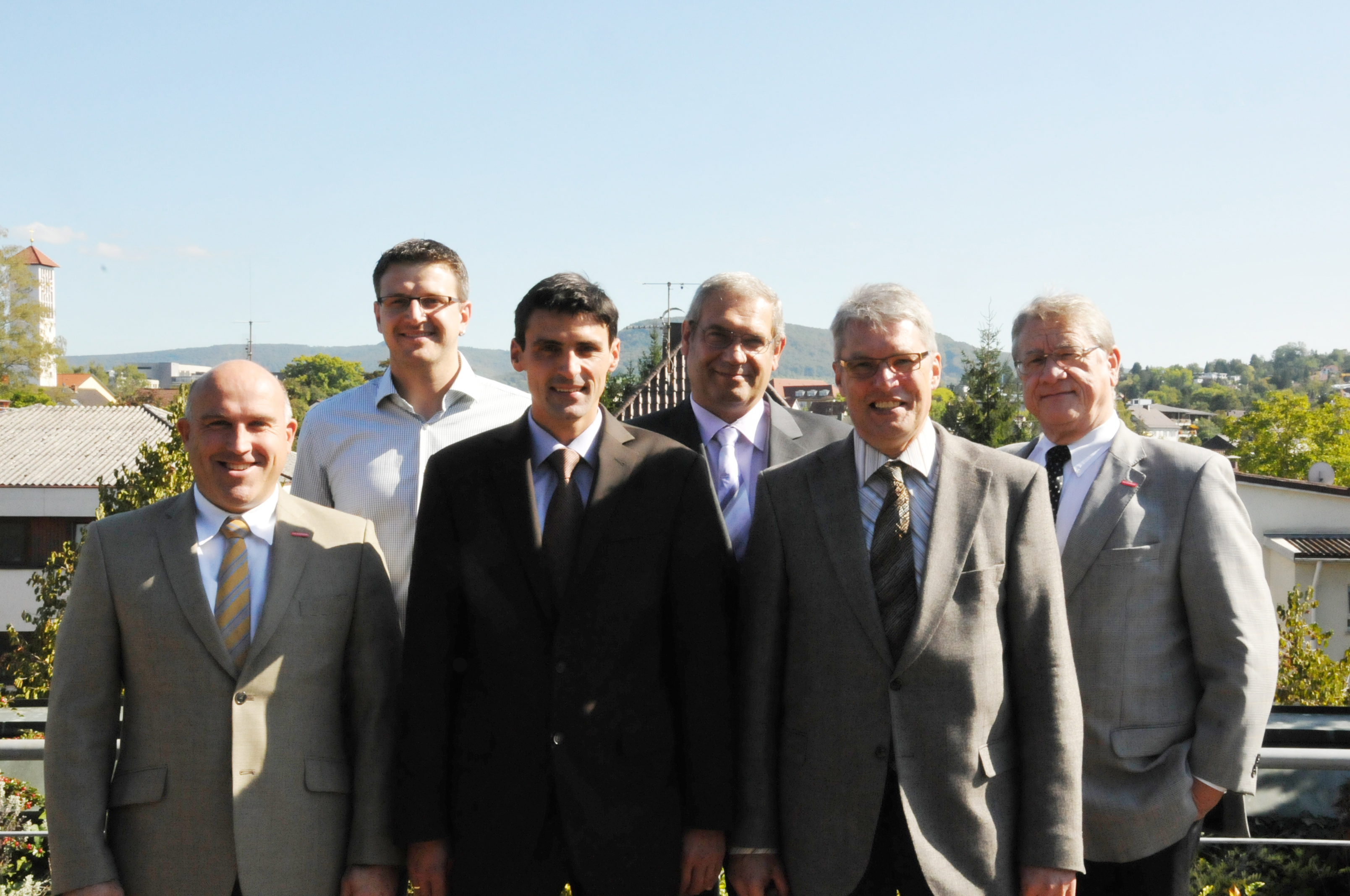 Siegfried Dreger, Geschäftsführer der Kreishandwerkerschaft Freudenstadt, Manfred Haug, Vorstandsmitglied der Handwerkskammer Reutlingen, Oliver Laurösch, Firmengründer Gerhard Nübel, Volker Nübel, Präsident Harald Herrmann, Christina Schmid, im Bauunternehmen für Personal zuständig, und Hauptgeschäftsführer Dr. Joachim Eisert (v.l.n.r.)