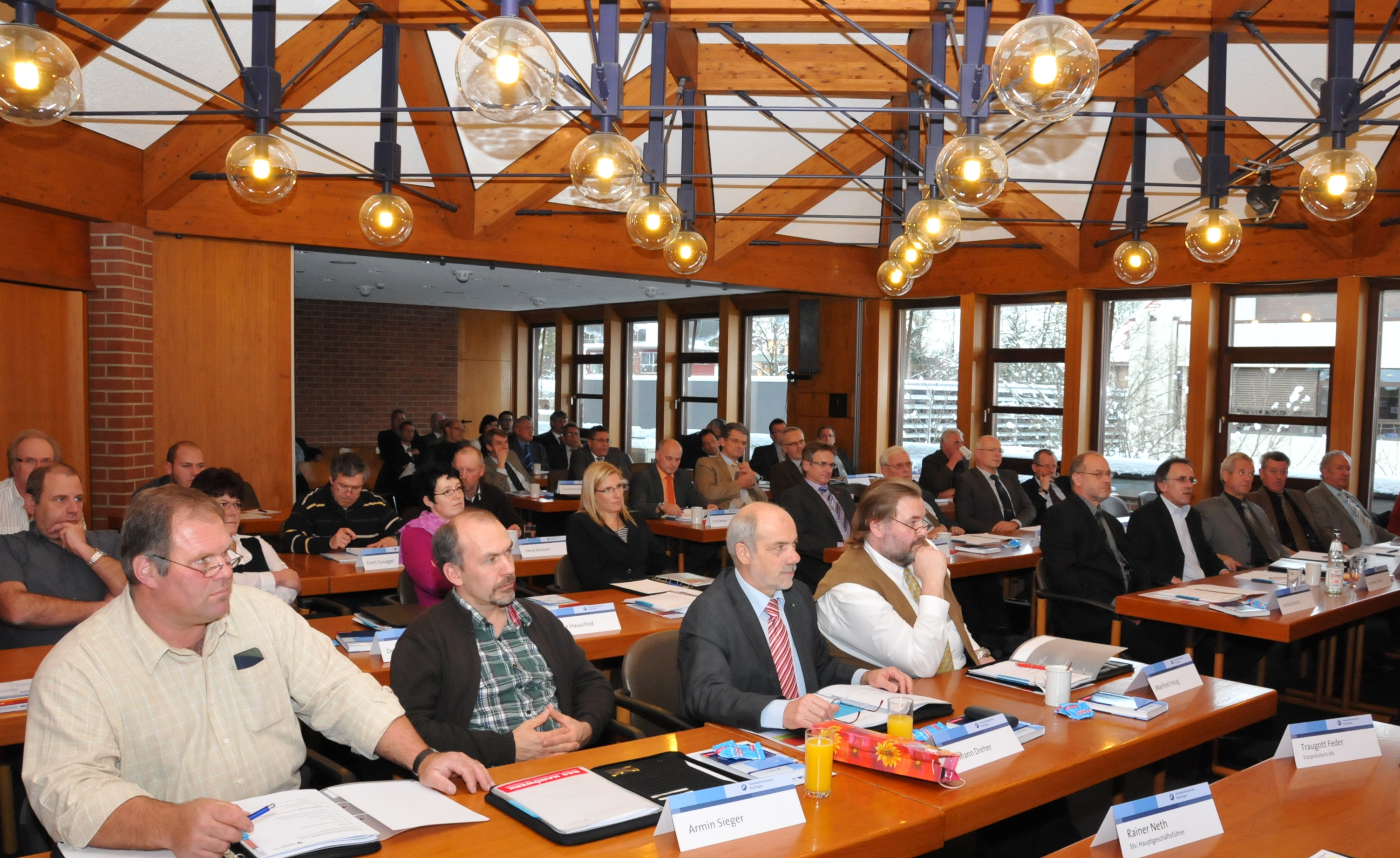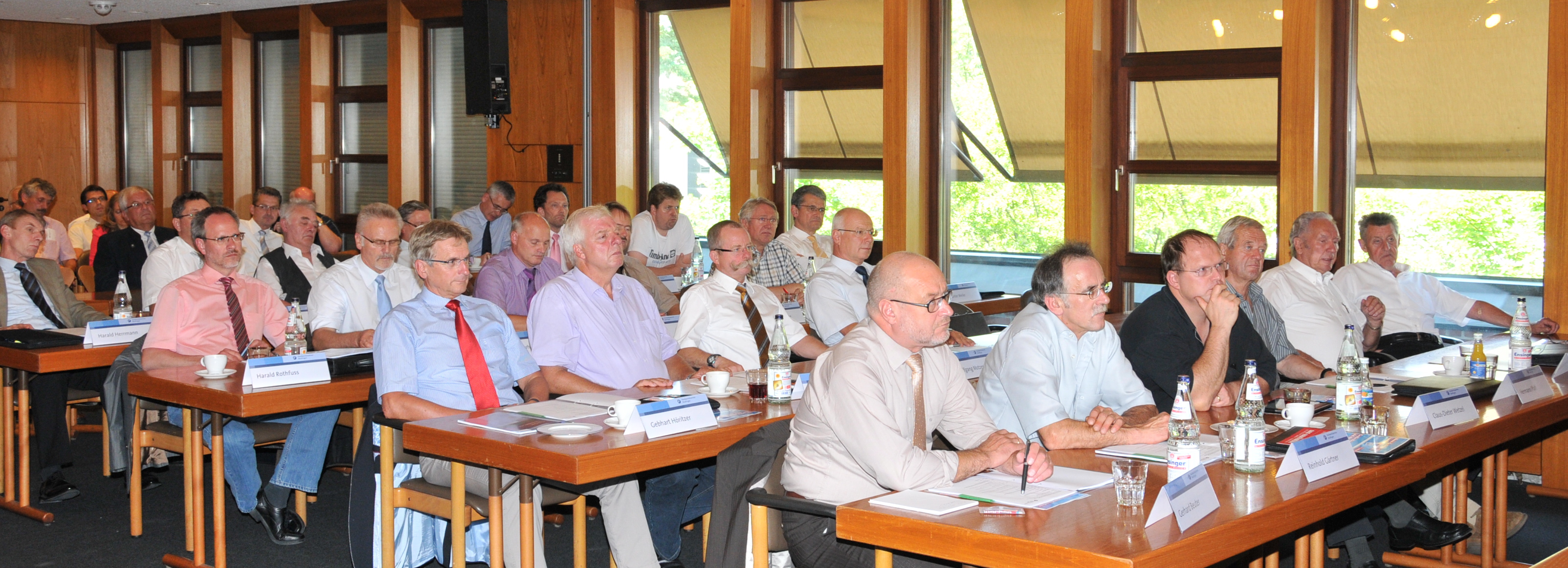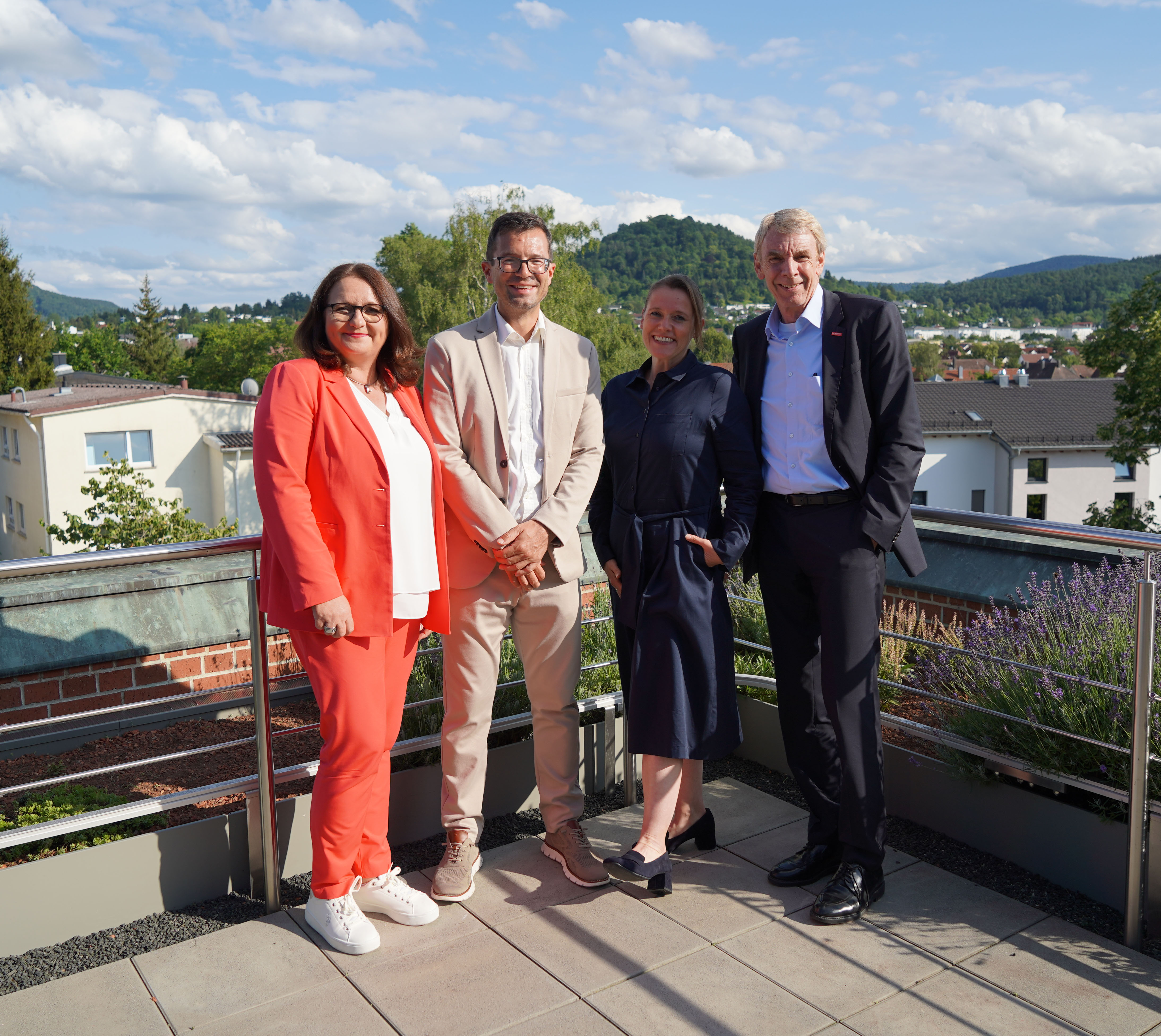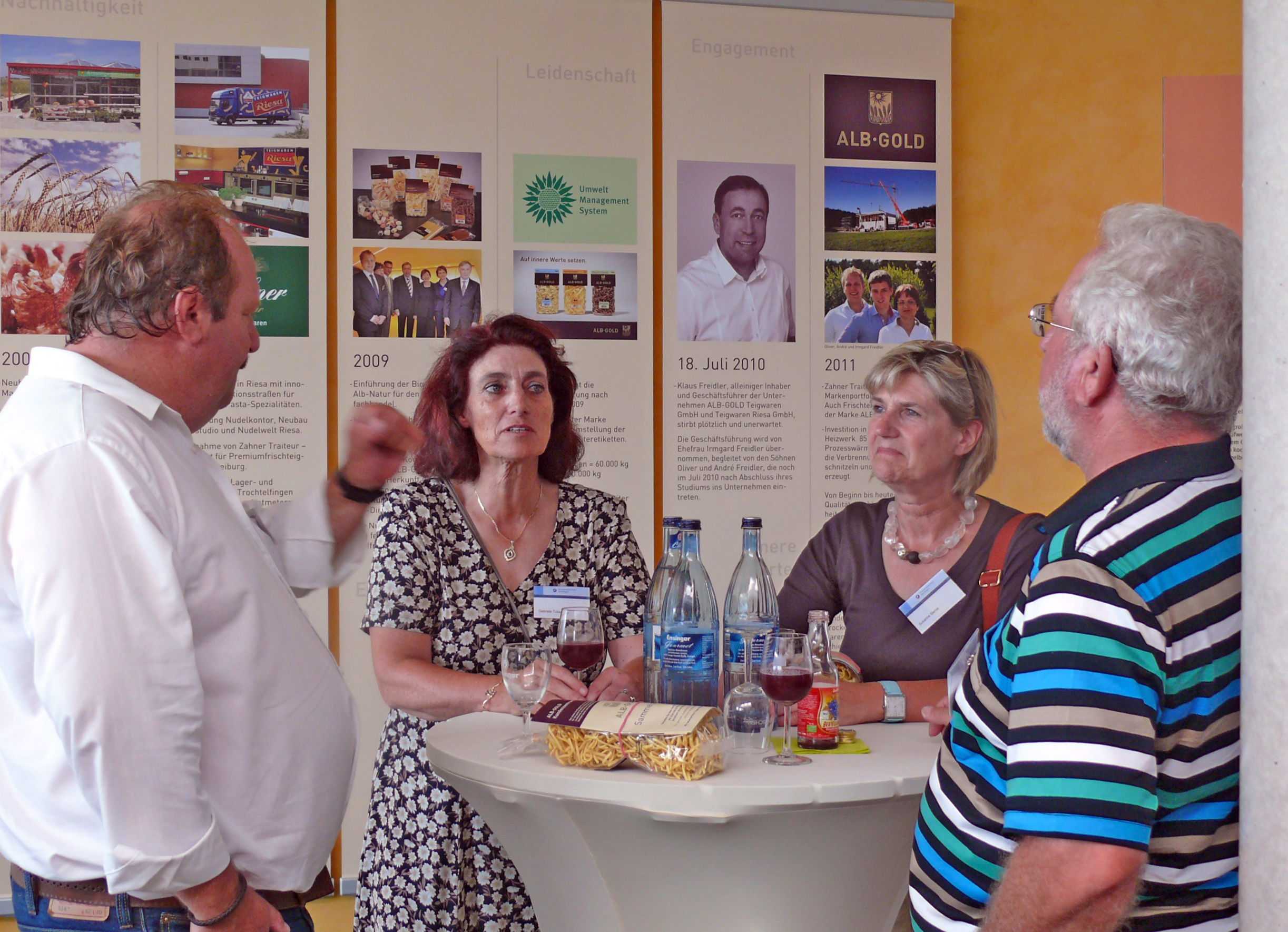 Siegfried Dreger, Geschäftsführer der Kreishandwerkerschaft Freudenstadt, Manfred Haug, Vorstandsmitglied der Handwerkskammer Reutlingen, Oliver Laurösch, Firmengründer Gerhard Nübel, Volker Nübel, Präsident Harald Herrmann, Christina Schmid, im Bauunternehmen für Personal zuständig, und Hauptgeschäftsführer Dr. Joachim Eisert (v.l.n.r.)