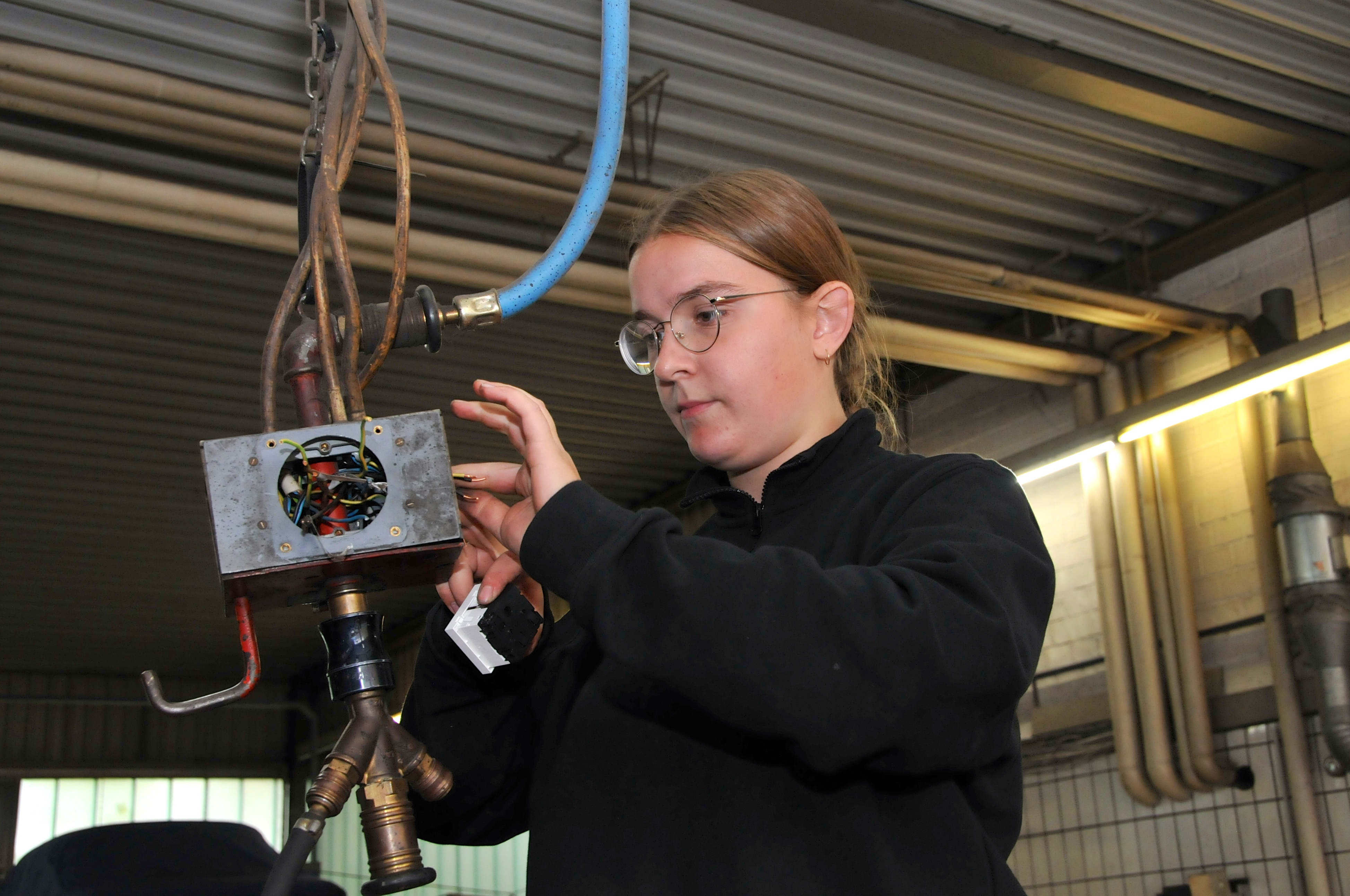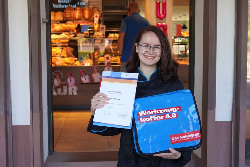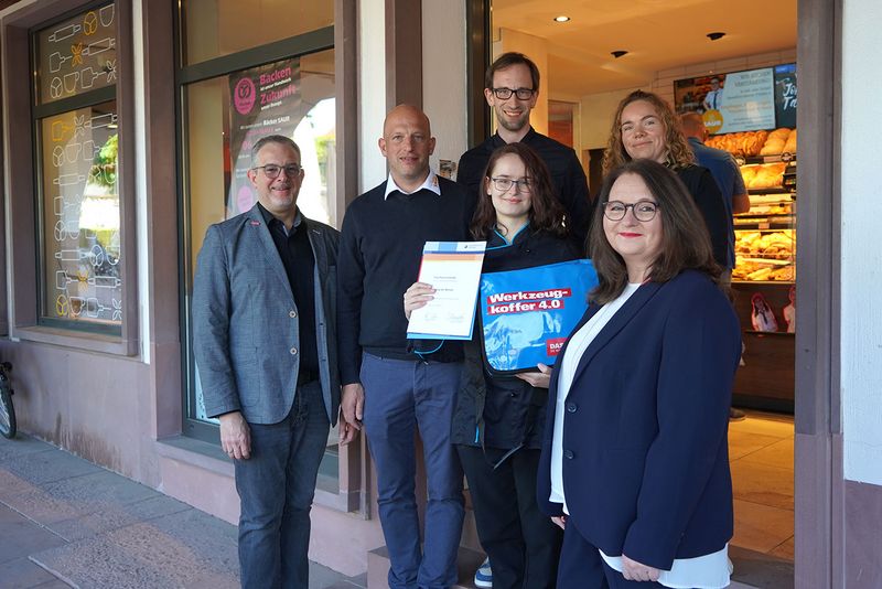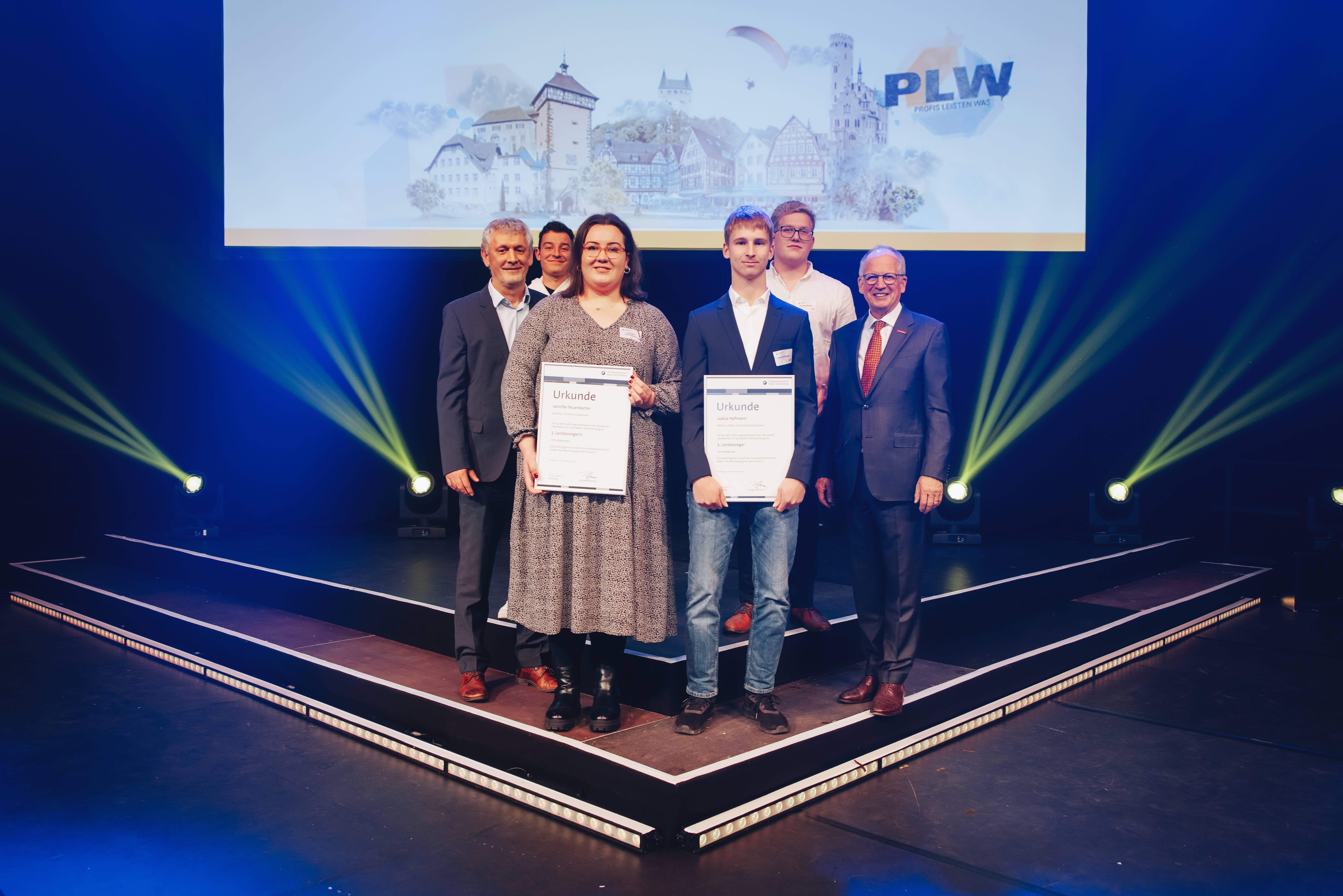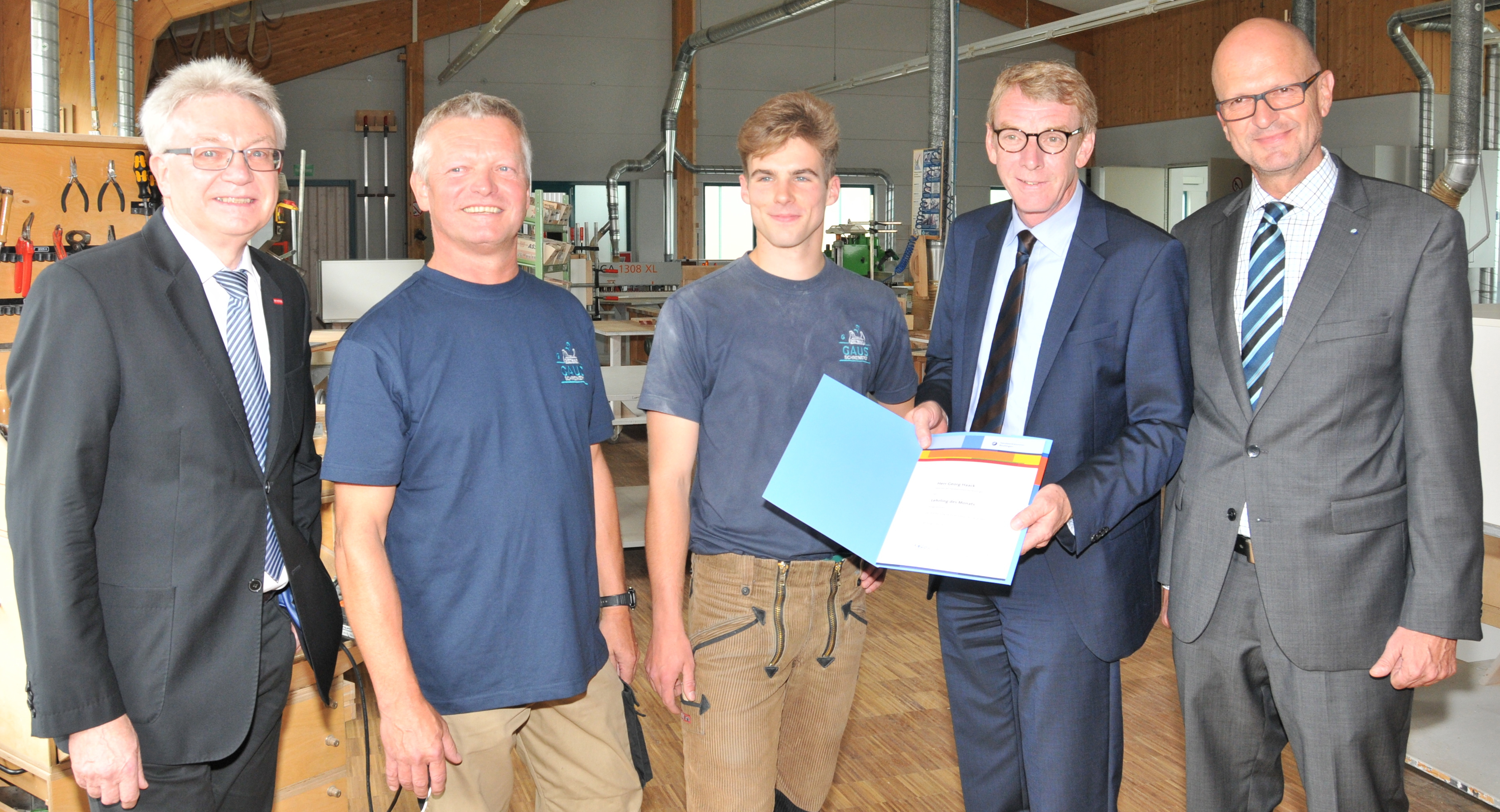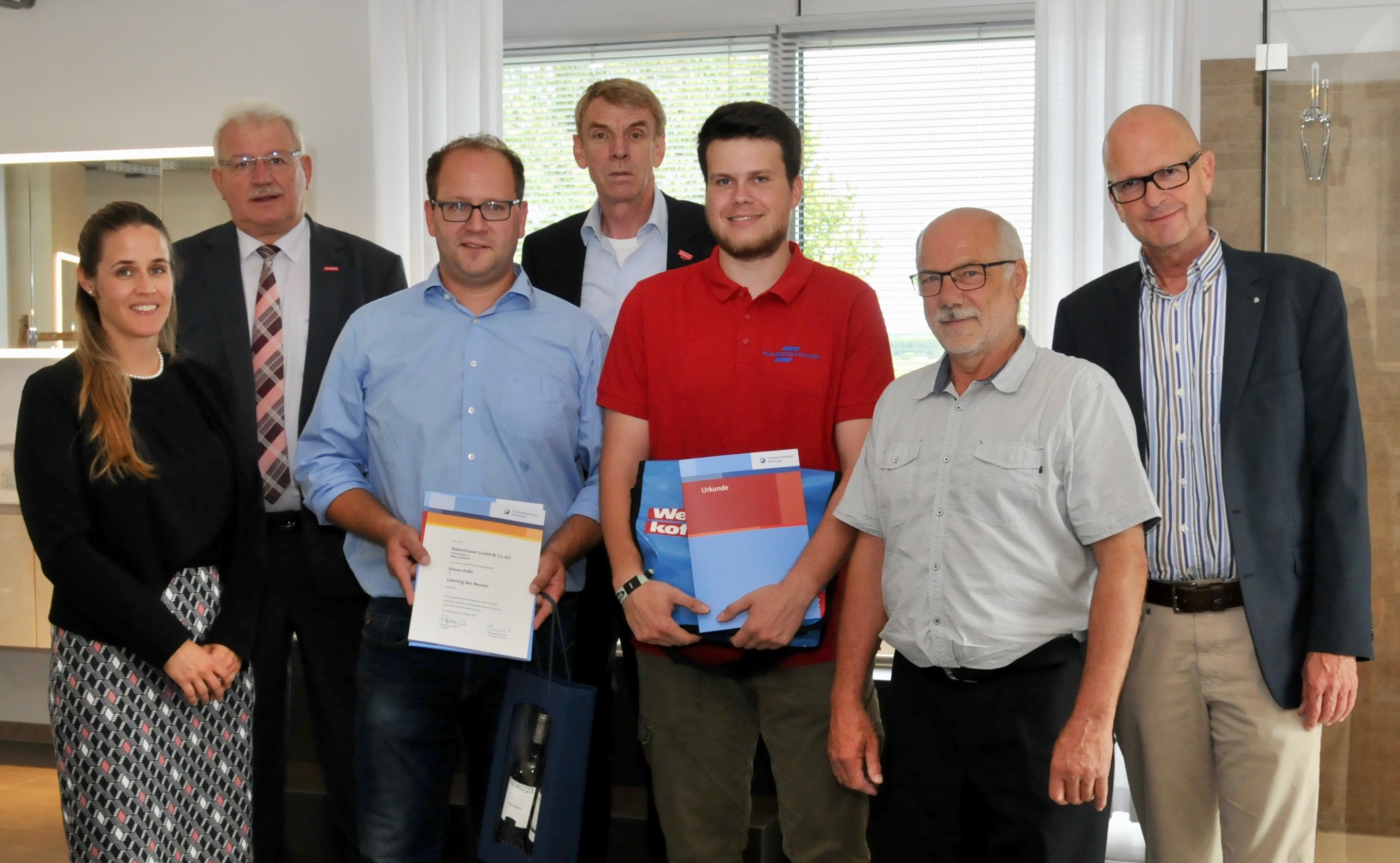 (v.l.n.r.) Patricia Griener, Geschäftsführerin der Kreishandwerkerschaft Sigmaringen, Siegmund Bauknecht, Kreishandwerksmeister, Manuel Nabenhauer, Geschäftsführer und Ausbilder, Harald Herrmann, Präsident der Handwerkskammer Reutlingen, Lehrling Simon Pröls, Hermann Dreher, Vorstandsmitglied der Handwerkskammer Reutlingen und Dr. Joachim Eisert, Hauptgeschäftsführer der Handwerkskammer Reutlingen bei der Urkundenübergabe / Foto: Handwerkskammer Reutlingen