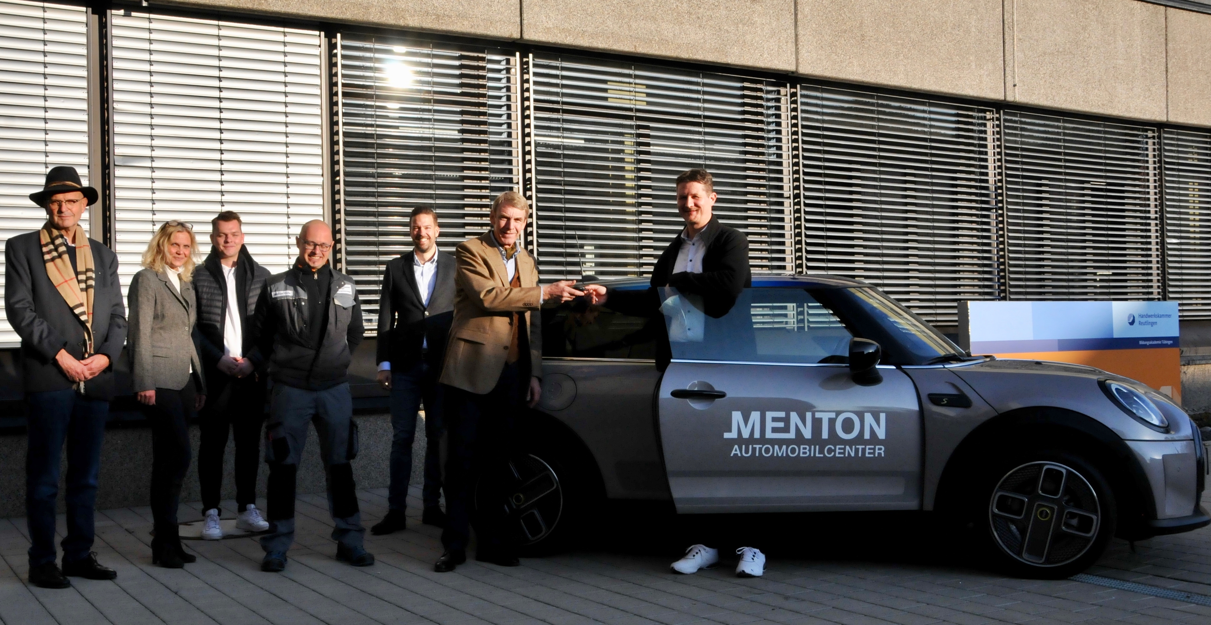 Feierliche Schlüsselübergabe vor der Bildungsakademie in Tübingen. (v.li.n.r) Dr. Joachim Eisert, Hauptgeschäftsführer der Handwerkskammer Reutlingen, Monika Kromer, stellvertretende Geschäftsbereichsleiterin der Bildungsakademie, Jonas van Rossenberg, Geschäftsleitungsassistent beim Autohaus Menton, Michel Deile, Kfz-Werkstattleiter der Bildungsakademie, Florian Pokahr, BMW Group, Harald Herrmann, Präsident der Handwerkskammer Reutlingen und Stefan Clauss, Autohaus Menton / Foto: mini-übergabe.jpg / Handwerkskammer