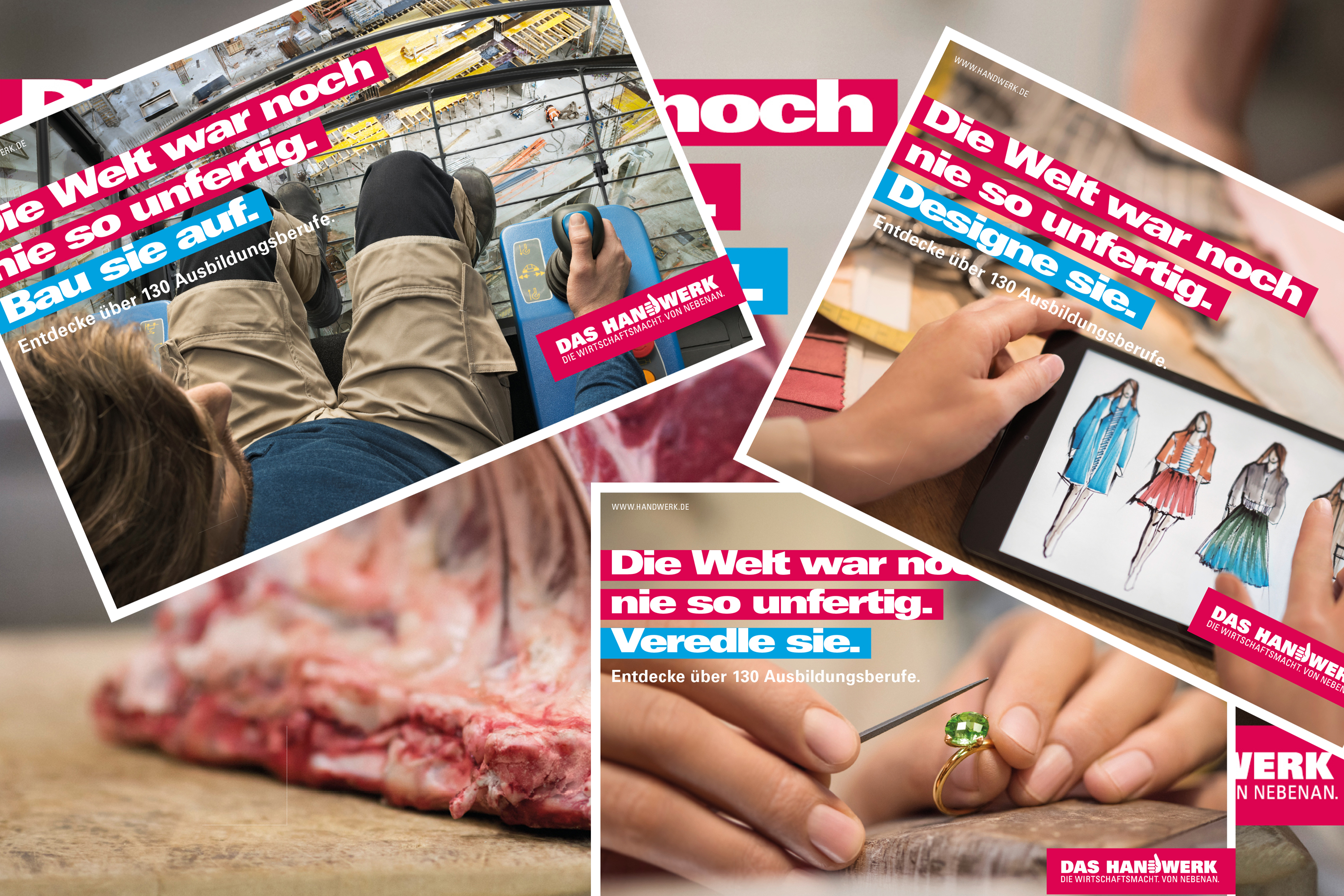 Die Hände und Werkzeuge junger Handwerker repräsentieren auf den Bildern die breite Palette der über 130 handwerklichen Ausbildungsberufe. Sie rufen junge Menschen dazu auf, ihre Zukunft im wahrsten Sinne des Wortes in die Hand zu nehmen: „Die Welt war noch nie so unfertig. Bau sie auf“, „Designe sie“, „Mach sie saftig“, „Mach sie smart“ oder „Veredle sie“.