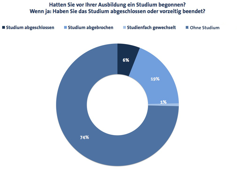 Rund 26 Prozent der befragten Jugendlichen hatten bereits ein Studium nach dem Abitur begonnen; drei Viertel von ihnen hatten es allerdings abgebrochen. Nur etwa jeder fünfte Studienanfänger hat sein Studium auch abgeschlossen und erst dann eine Ausbildung begonnen.
