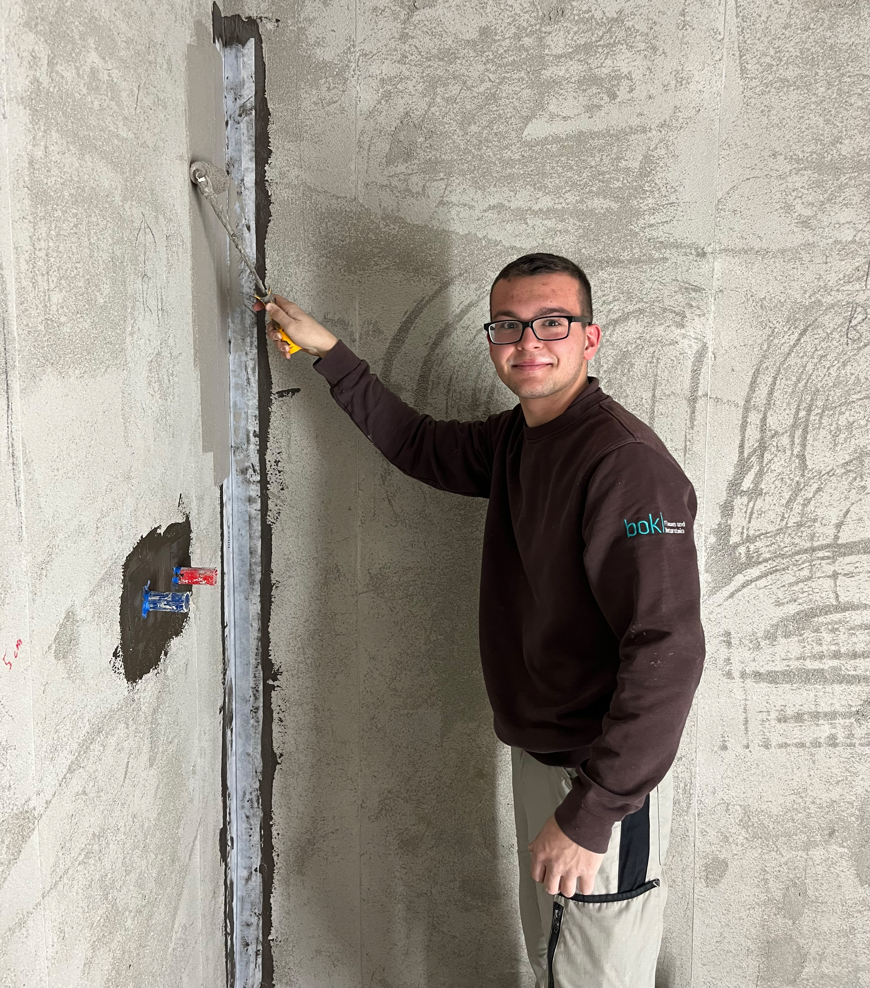 Über das Vertrauen, das ihm sein Ausbildungsbetrieb entgegenbringt, und die Chance, schon früh selbständig arbeiten zu können, freut sich Pfeffer. „Das ist wichtig, weil es eine Bestätigung ist und mich weiter motiviert.“ Nach seinen Lieblingstätigkeiten gefragt, nennt er das Ausfugen und den Trockenbau. Am anderen Ende der Skala rangiere derzeit das Estrichlegen. Da würde er manchmal am liebsten einen Bogen herum machen. Aber, das gehöre eben auch dazu, weiß Pfeffer. Über seine berufliche Zukunft hat er bereits klare Vorstellungen. „Ich möchte meine Ausbildung gut abschließen, danach würde ich gerne den Meister machen.“