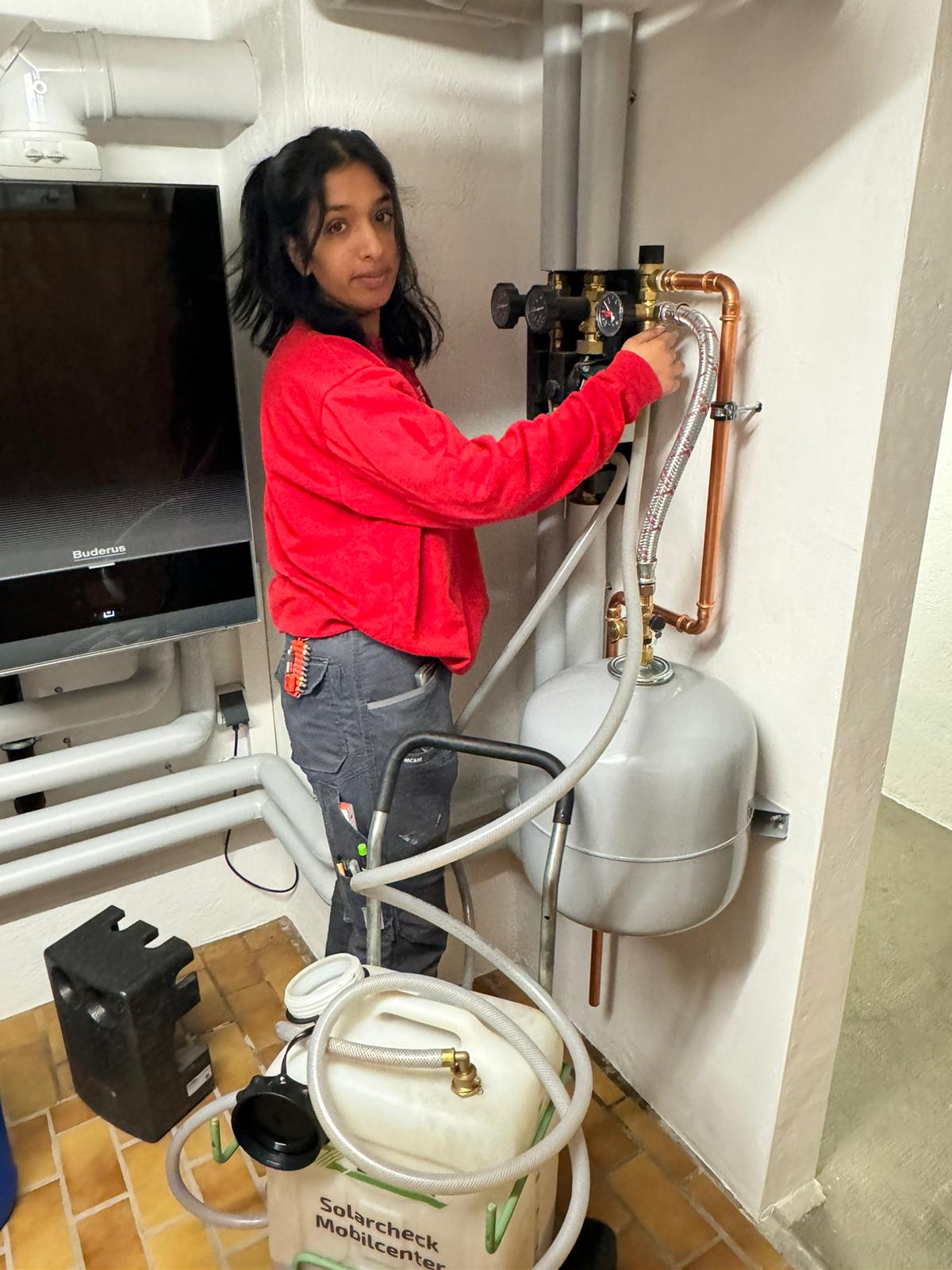 An ihrem Beruf liebt die Ammerbucherin die Abwechslung. Ob Sanitärarbeiten wie Badsanierungen, sanitäre Installationen oder Heizungsarbeiten wie Heizkörpermontage, Heizungssanierungen – sie macht und erledigt alle Arbeiten gleich gerne und gleich gut. Stolz ist die Auszubildende besonders darauf, dass sie mit ihrer Arbeit tagtäglich zur Energiewende im Heizraum oder auf dem Dach beiträgt. Und die Arbeit ist nicht ohne, denn dafür bedarf es Geschick und Köpfchen, und beides hat Simran eindeutig. Benjamin Schaible: „Wenn sie ihre Ausbildung beendet, ist sie in der Lage, Haushalte und Betriebe mit Wasseranschlüssen und Sanitäranlagen auszustatten oder bei modernen Heizungsanlagen wie Wärmepumpen individuelle Lösungen zu finden. Sie wird zudem Anlagen für die Wasserversorgung und -entsorgung bauen können und moderne Bäder einrichten. Dass sie die Regel- und Steuertechnik von Heizungsanlagen beherrschen muss, versteht sich von selbst.“ Dass sie dabei auf Baustellen arbeitet oder direkt beim Kunden zu Hause, gefällt Simran, die in ihrer Freizeit gerne Basketball spielt. Nach ihrer Ausbildung freut sie sich, im Betrieb übernommen zu werden.