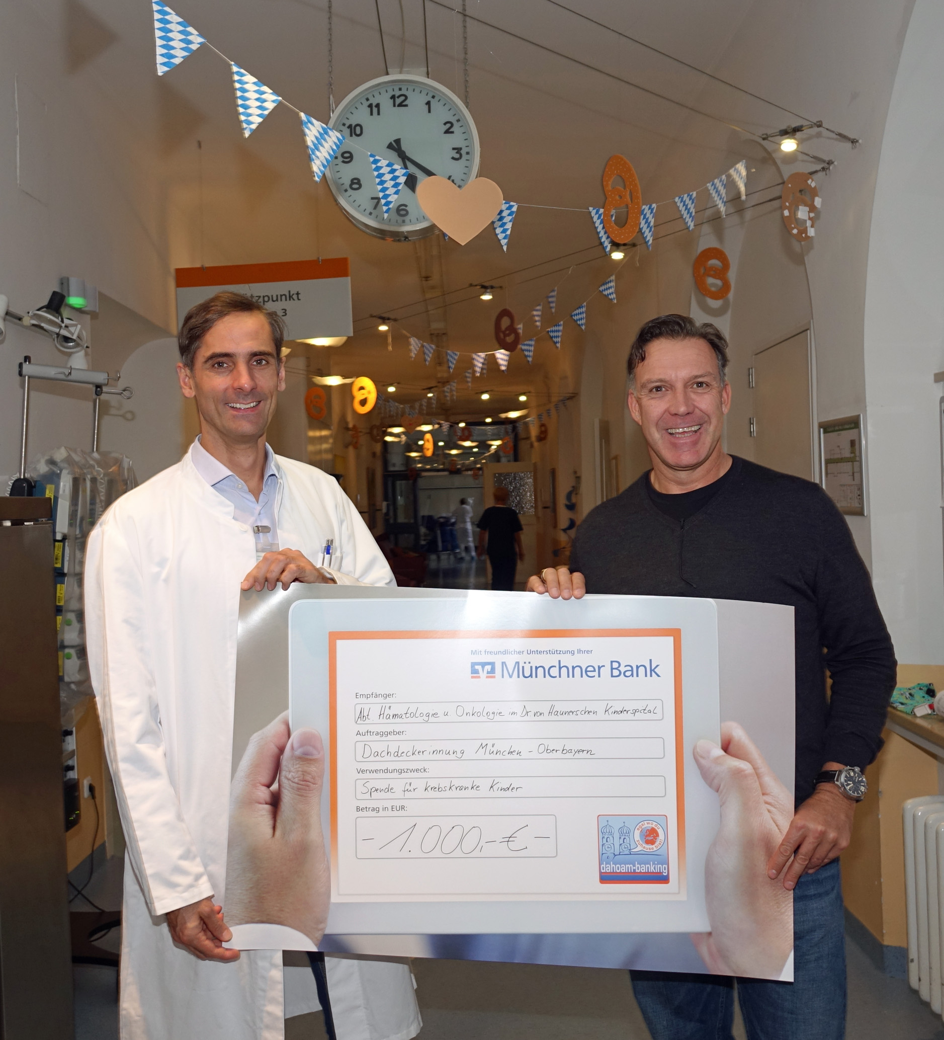 Einen symbolischen Scheck über 1.000 Euro überreichte der Obermeister der Dachdecker-Innung am Montag, 2. Oktober, an den Prof. Dr. Tobias Feuchtinger. Die Dachdecker der Innung München-Obb. hatten auch in diesem Jahr auf dem Stadtgründungsfest München Schieferherzen geschlagen und sie gegen eine Spende abgegeben. Den Erlös rundete die Innung wieder auf volle 1.000 Euro aus der Innungskasse auf.