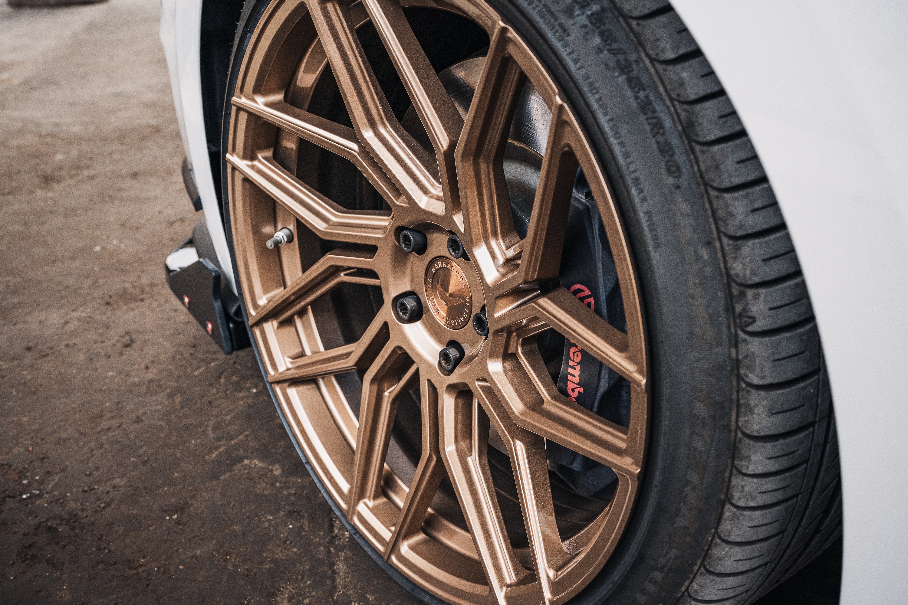 The Mustang stands on Dragoon rims from Barracuda's Ultralight Series. Thanks to the flow-forged production process, these are particularly lightweight. While the dimensions are 10x20 inches all around, the tires for the front and rear are different: 255/30R20 at the front and 275/30R20 at the rear. Leon chose a bronze finish, which makes the Dragoons stand out strikingly against the Liquid White paintwork of the body. The obligatory lowering was achieved using coil springs from ST suspensions.