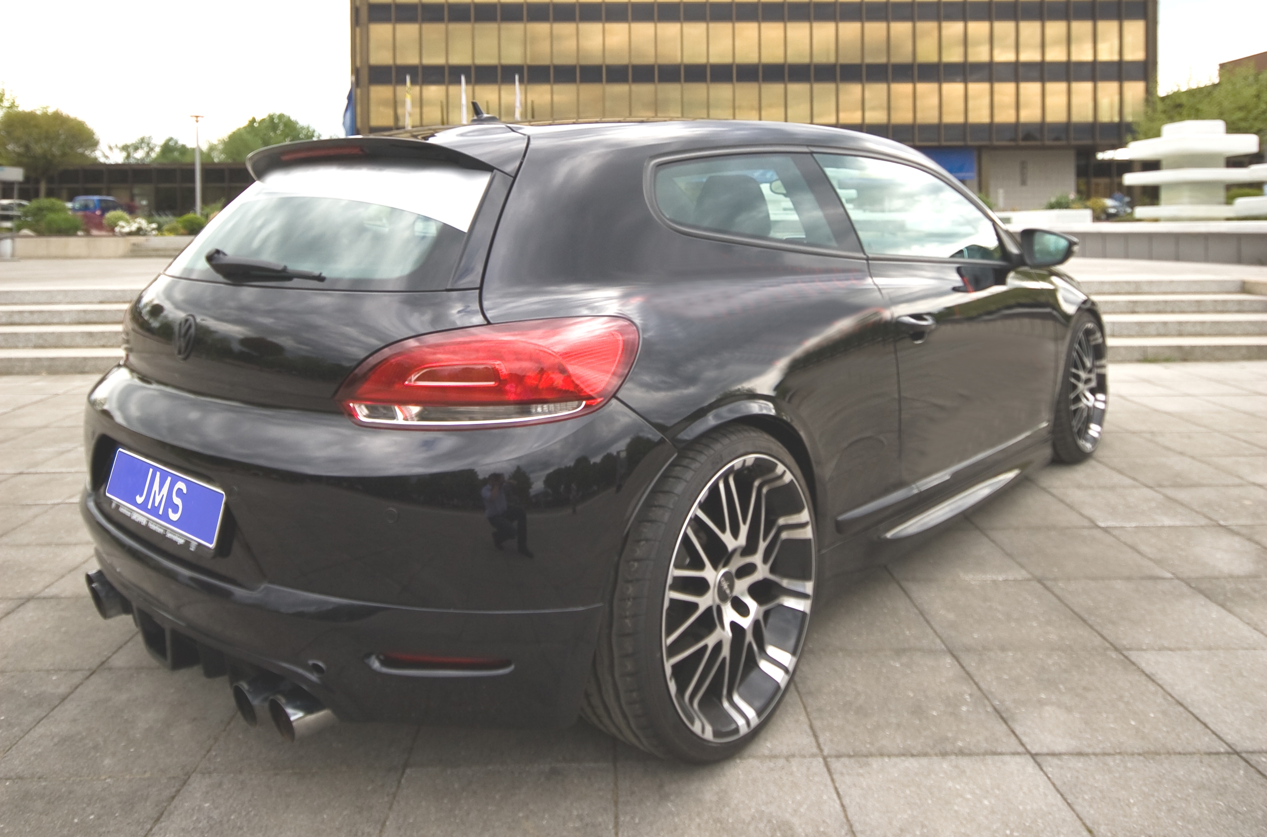 (lifepr) (Walddorfhäslach, 14.07.2009) Nachwürze für den VW Scirocco II: JMS-Fahrzeugteile hat sich das Wolfsburg Coupé in Zusammenarbeit mit der Firma TIJ-Power vorgenommen und bietet ab sofort ein umfangreiches Tuningprogramm für den Zweitürer an. Eine zusätzliche Spoilerlippe hat der Tuner für 239 Euro im Programm Auch am Heck hat JMS Hand angelegt: Eine neuer Heckansatz mit Diffusorlook und Echtcarboneinlage steht für 259 Euro in der Preisliste.