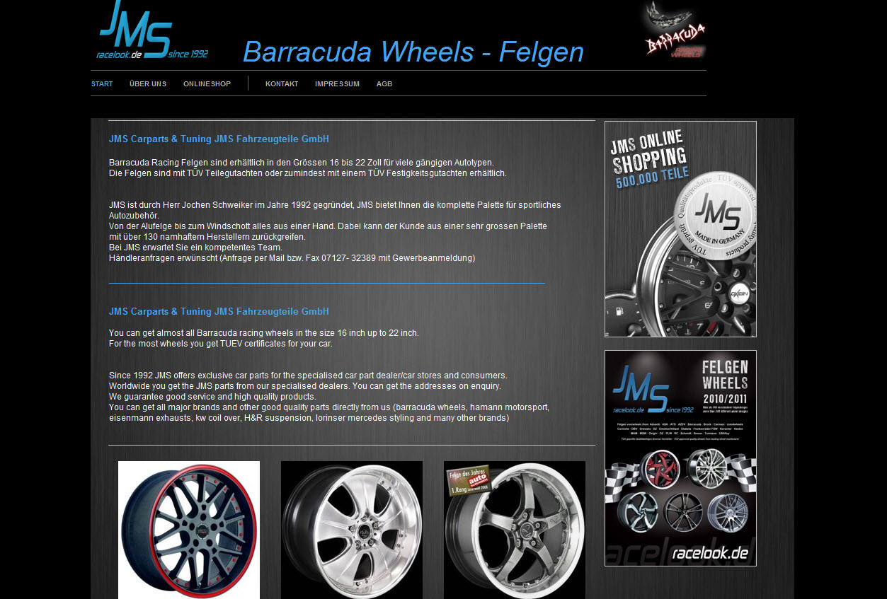 (lifepr) (Walddorfhäslach, 26.08.2010) Seit 2002 vertreibt die Firma JMS Fahrzeugteile GmbH Barracuda Felgen . Ab sofort gibt es hierzu eine spezielle Imageseite www.barracuda-felgen24.de mit Verlinkung in die Shoprubrik.