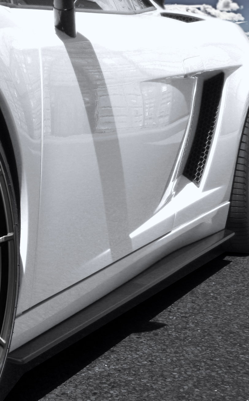 (lifepr) (Walddorfhäslach, 27.09.2011) Die Bestandteile der JMS Umbaumassnahmen im Einzelnen: Zuerst wurde die störende große Seriennummerntafelhalterung durch eine neu entwickelte kleinere Version 400x115 ersetzt (Euro 399). Um den Look des Topmodells Gallardo Superleggera zu erhalten , wurden hochwertige Seitenschweller an den Flanken montiert. Diese sind in zwei Versionen erhältlich, schwarz matt mit Oberflächenveredelung (1899 Euro) und in Echtcarbon mit einem Klarlackfinish (Euro 3299). Lt. JMS liegt jedoch für die Schweller kein TÜV Teilegutachten vor und somit ist eine Eintragung nur per Sonderabnahme möglich.