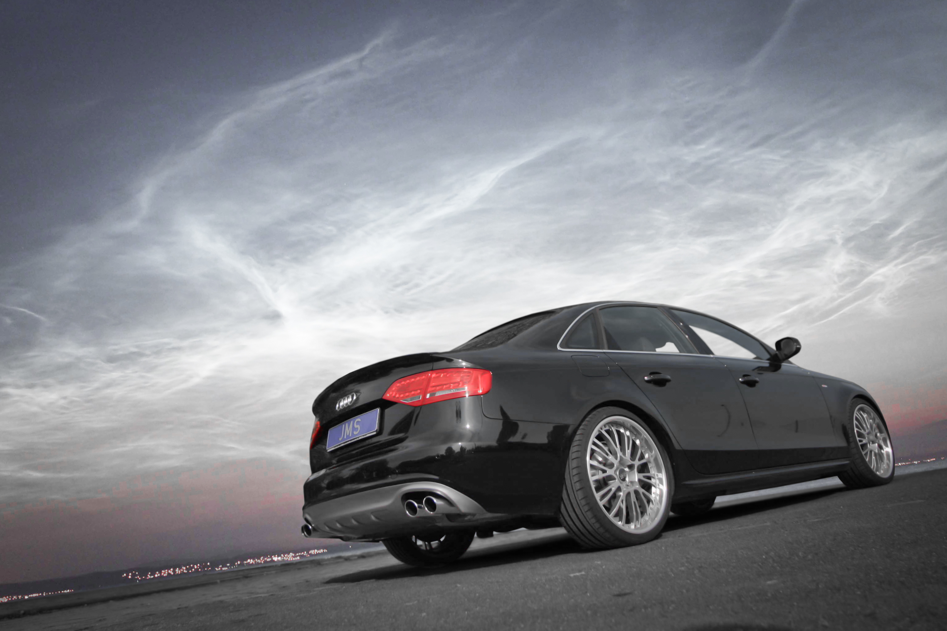Das Heck wird mit einem sportlichen Heckeinsatz (Euro 239 )für links/rechts Auspuff (max. 4x90x70mm Endrohre möglich) aufgewertet , dieser ersetzt die Serienheckblende. Die Frontlippe und der Heckeinsatz passt übrigens bei Limousine und Avant.. Lt. JMS wird durch den Anbau der Teile die Alltagstauglichkeit nur minimalst eingeschränkt, da man gerade einmal an der Front 20mm tiefer und am Heck 10mm tiefer kommt. Aufgrund dieser dezenten Veredlung kann komplett auf Seitenschweller verzichtet werden.