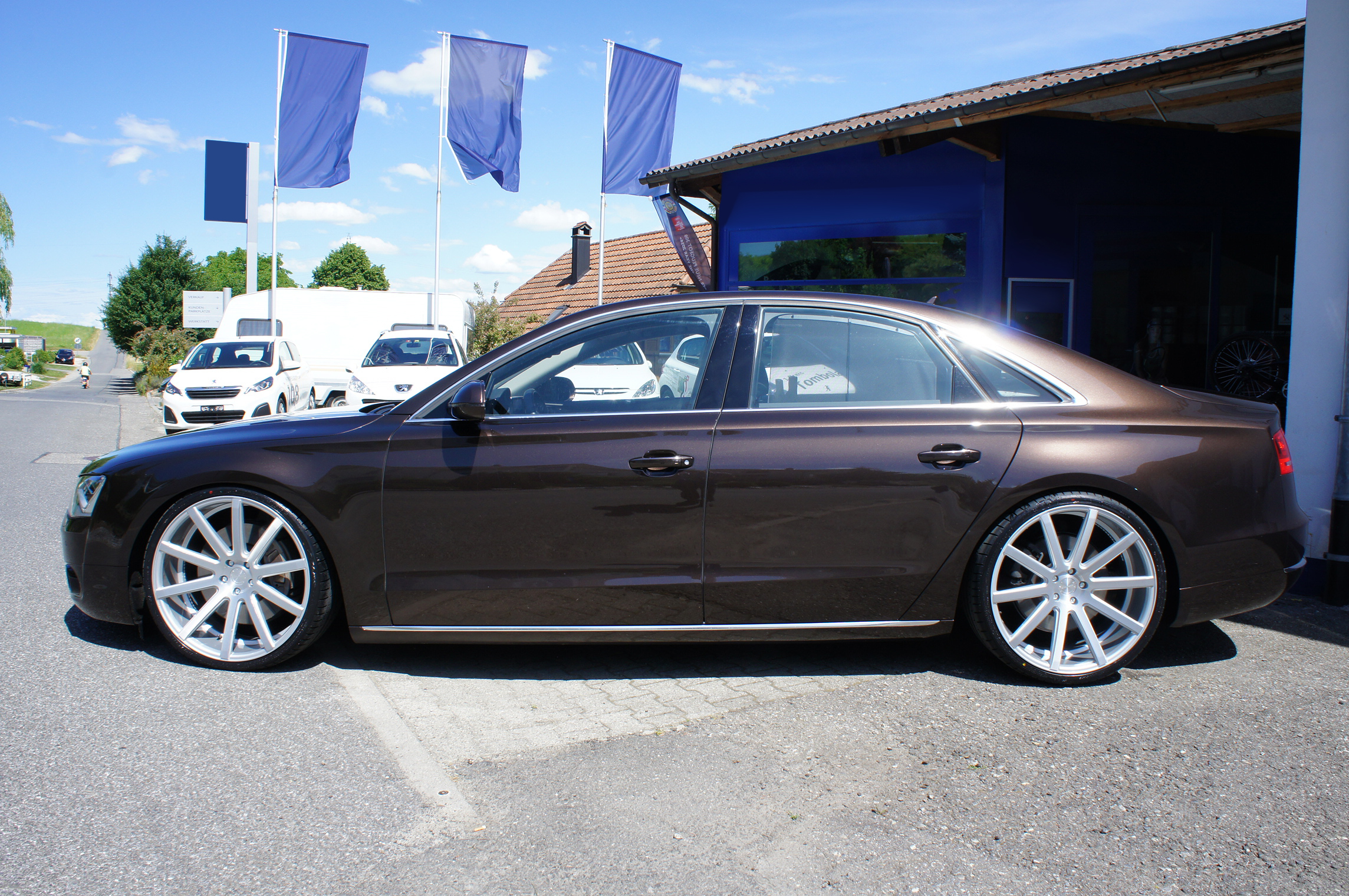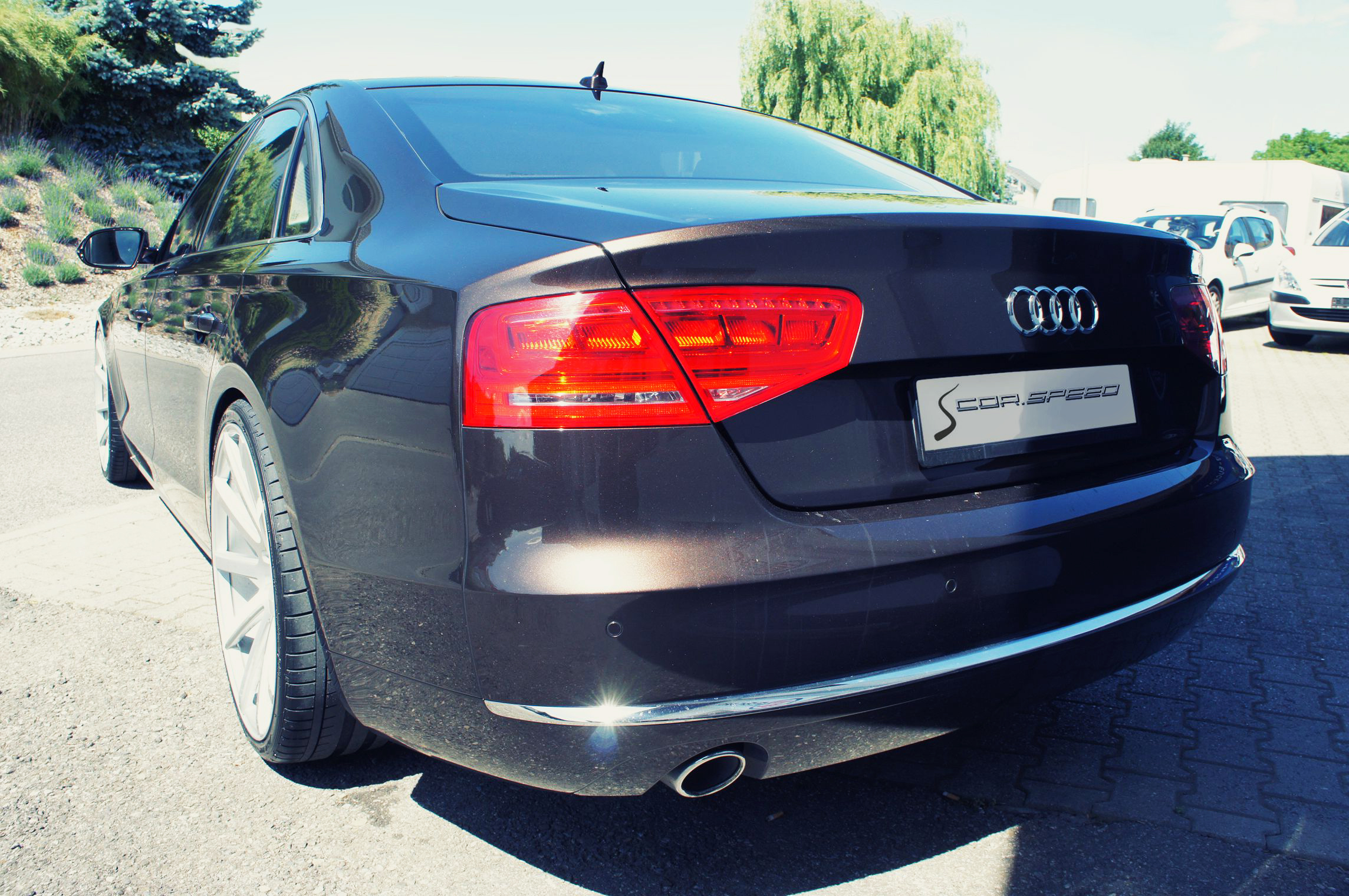 The wheels on this car are the classic ten-spoke Cor.Speed Deville 10.5x22-inch design in the classic Finish Silver Brushed Surface, shod with 265/30ZR22 tyres. This combination (599 euro per corner) fills the A8’s big arches perfectly thanks to a set of 10 mm spacers. No bodywork alterations are required.