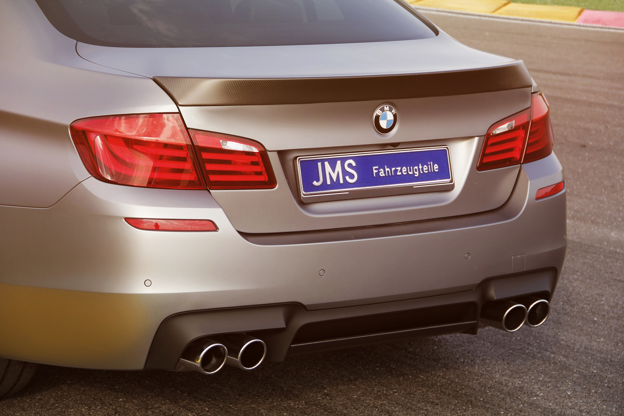 Die Mannen aus Walddorfhäslach montieren an der Front ihr Spoilerschwert der Racelook Exclusive Line (449 Euro), welches jedoch über keine Straßenzulassung verfügt und daher nur für den Export bestimmt ist. Selbiges gilt für das Heckdiffusorschwert, das zu einem Preis von 299 Euro zwischen den Doppelendrohren verbaut wird. Letztere messen jeweils 2x90 Millimeter und gehören zur Eisenmann-Abgasanlage samt X-Pipe (3.700 Euro). Für weitere 879 Euro installiert JMS ferner einen KW-Gewindefedersatz mit einer justierten Tieferlegung von 30 Millimetern an der Vorder- und 25 Millimetern an der Hinterachse.