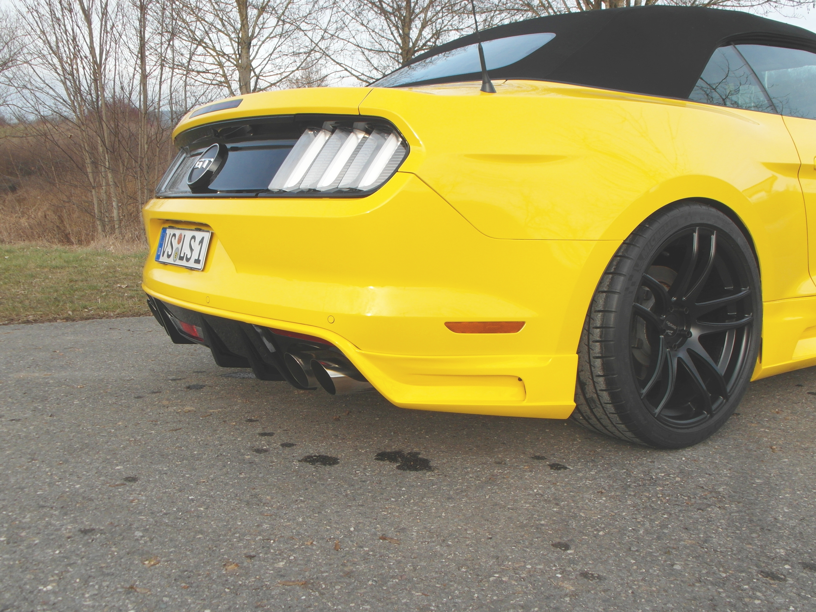 A set of five twin-spoke Barracuda Racing Wheels ‘Shoxx’ alloy wheels in 9.0 and 10.5x20-inch, and shod with 255/35R20 and 275/35R20 tyres fill out the wheel arches perfectly using 5 mm spacers. Their Matt-Black finish is a sharp contrast to the Mustang’s yellow paintwork, yet a perfect match for the black soft top. This TUV certified wheel and tyre set costs 2,649 euro.