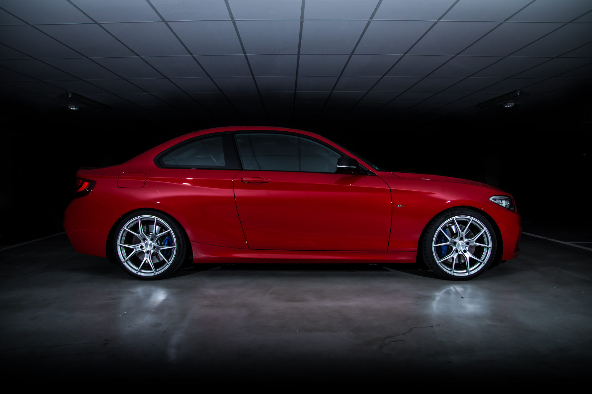 Das Barracuda Inferno-Rad passt nicht nur optisch bestens zum sportlichen BMW-Zweitürer, sondern auch namentlich perfekt zu dessen feuerroter Lackierung. Sie verfügen über die Dimensionen 8,5x19 Zoll sowie 9,5x19 Zoll, wobei in diesem Fall an der Hinterachse Karosseriearbeiten nötig sind. Bezogen sind die Felgen im Finish gun metal polished mit Reifen der Dimensionen 225/35R19 und 245/30R19.