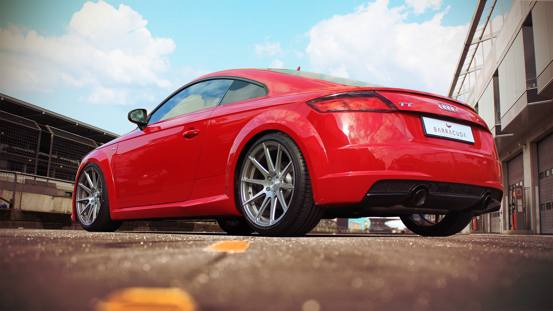 Dies unterstreicht das in knalligem Rot lackierte Exemplar des Sportcoupés, welches mit einem Satz der neuen Barracuda Ultralight Project 2.0-Felgen ausgerüstet wurde. Das Rad wird im innovativen Flow-Forming-Verfahren produziert und besitzt dadurch – wie die Bezeichnung Ultralight bereits nahelegt – in der hier genutzten Größe 9,5x19 Zoll (508 Euro) ein äußerst geringes Gewicht von nur 9,7 Kilogramm. Damit ist auch die ungefederte Masse niedrig, was der Fahrdynamik zugute kommt. Die mit einer Bereifung in 245/35R19 und unter Verwendung von zentrierten Barracuda-Distanzscheiben (60 Euro/Paar) am Audi montierten Felgen tragen ein Finish in Silver Brushed Surface (gebürstete Front mit Klarlack-Versiegelung), alternativ ist das Rad in Gunmetal (Dunkelgrau) erhältlich. Das Anbringen der konkaven Ultralight Project 2.0, die über eine gute Bremsfreigängigkeit und ein Teilegutachten verfügt, ist am aktuellen TT in der genannten Dimension ohne Karosseriearbeiten möglich. Ergänzend zum neuen Radsatz erhielt das Coupé ein KW Variante 3-Gewindefahrwerk (ab 1.770 Euro), das es vorne um 45 und hinten um 35 Millimeter tieferlegt.
