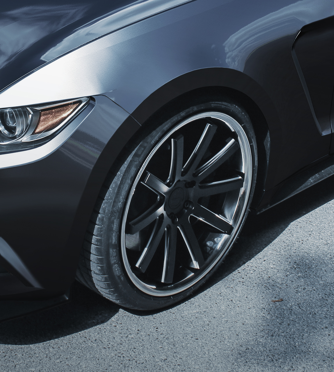 The choice fell on the recently obtainable Deville Inox rim, which is distinguished by a concave design and spokes milled according to the process patented by Licardor. The spokes, which run up to the outer edge of the rims, make the wheels look very large despite their stainless steel drop center rims. What is more, this layout ensures that the ten spokes have ample brake clearance. The wheel is available with 5x108, 5x112, 5x114 and 5x120 bolt circles. On the Mustang, they have 10x20” dimensions all around (499 euros). This lets them fill up the wheelhouse perfectly in combination with their 255/35ZR20 tires.