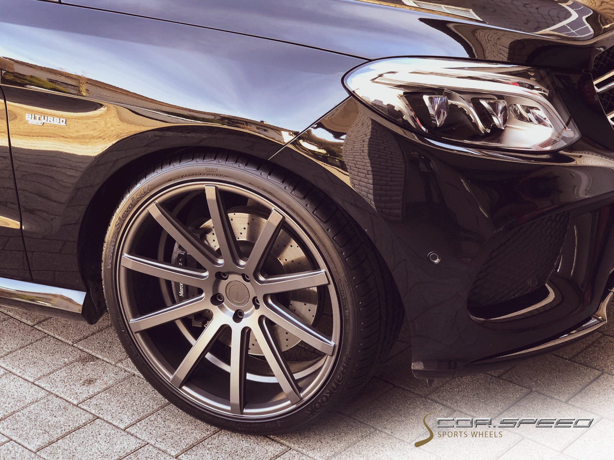 Die Wahl fiel auf die Deville gunmetal Felgen, die sich durch ein konkaves Design und die sportliche elegante Speichenform auszeichnen. Die bis an die Außenkante des Felgenrands auslaufenden Speichen lassen die Räder sehr groß wirken. Zudem gewährleistet dieser Verlauf der zehn Speichen eine sehr gute Bremsen-Freigängigkeit. Erhältlich ist die Felge mit den Lochkreisen 5x108, 5x112,5x114,3,5x120 und 5x130 in den Grössen 19-22 Zoll. Am GLE besitzen sie rundum die Dimensionen 10,5x22 Zoll (599 Euro). Damit füllen sie die Radkästen des SUV`s in Verbindung mit ihrer Bereifung in 295/30R22 perfekt aus.