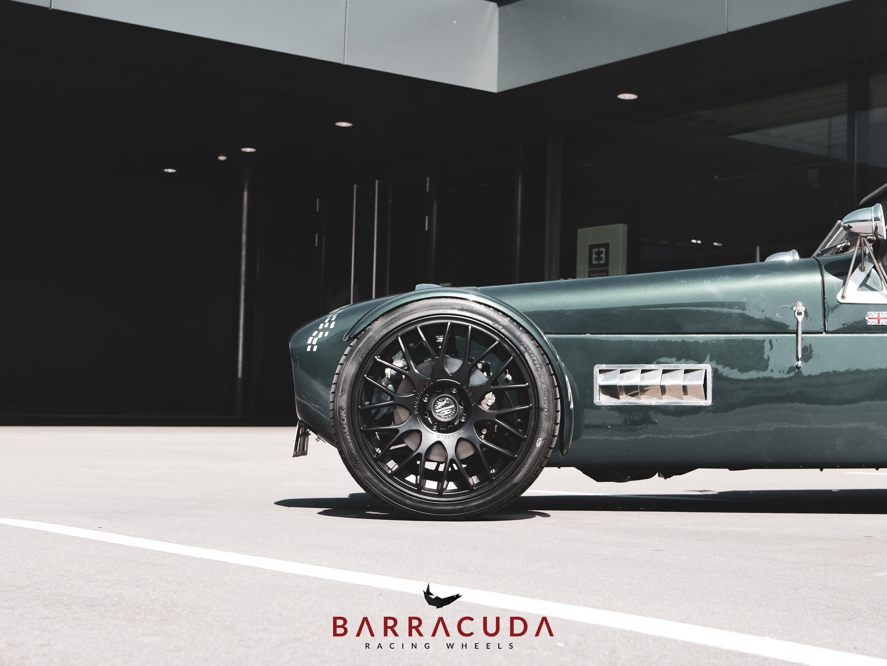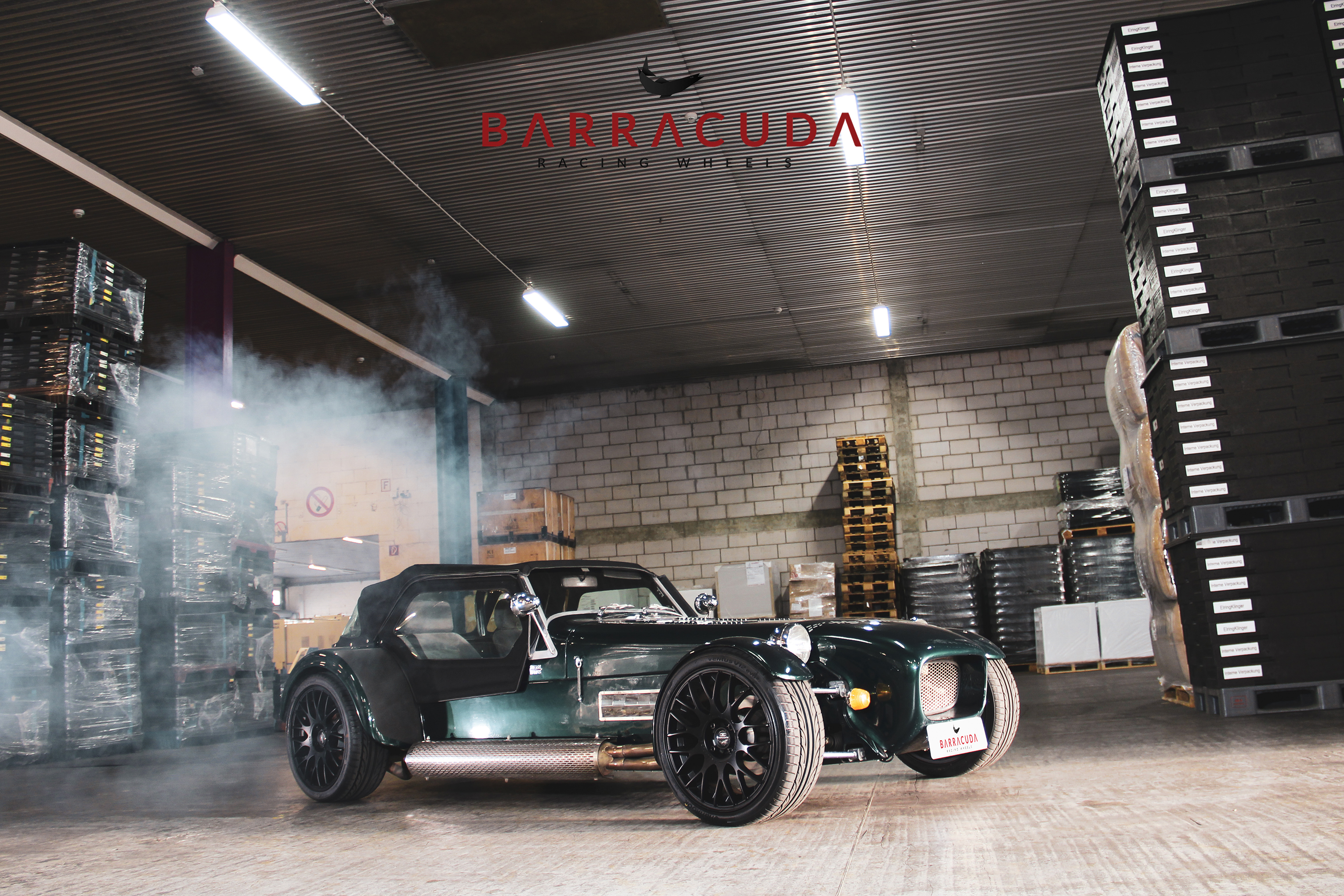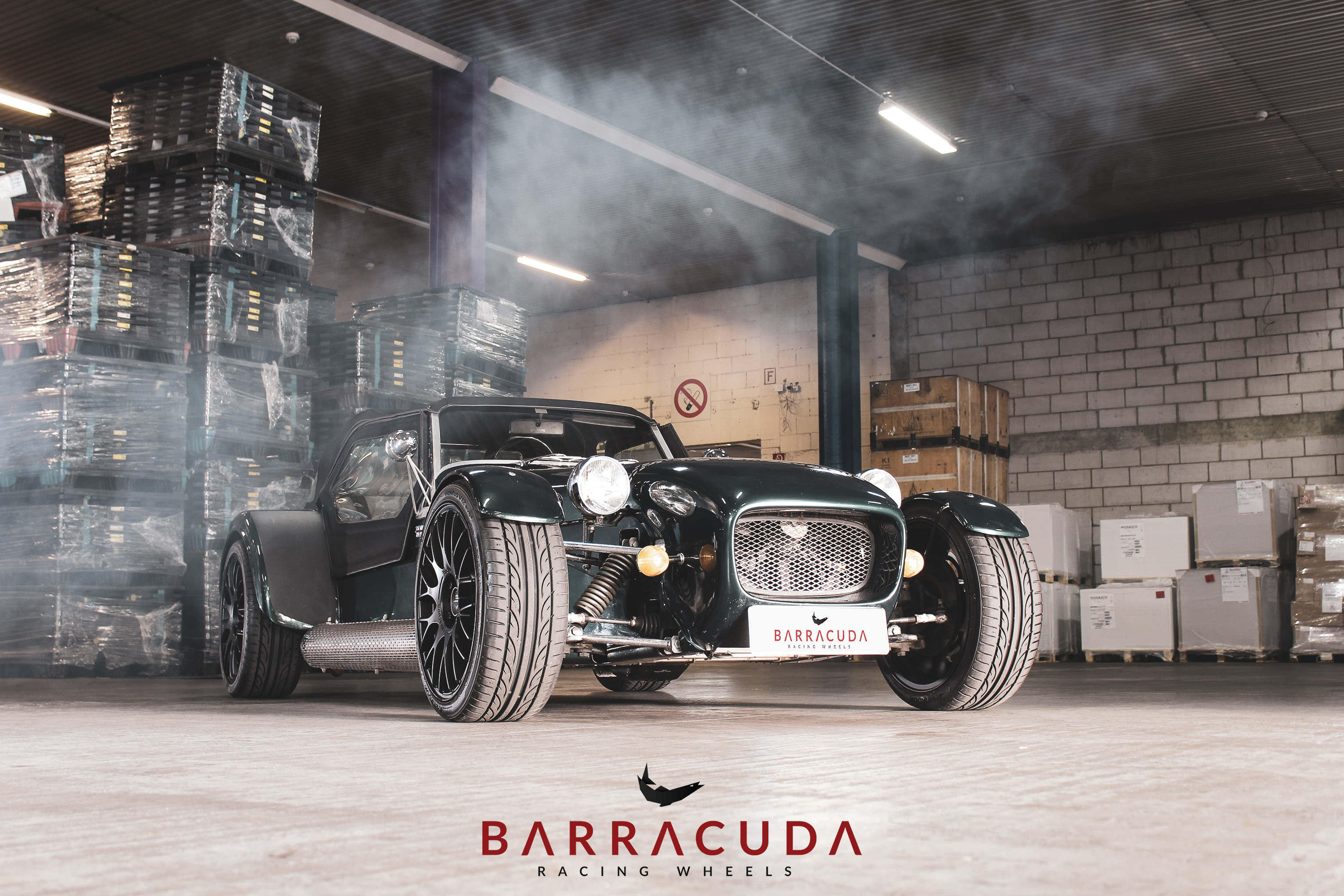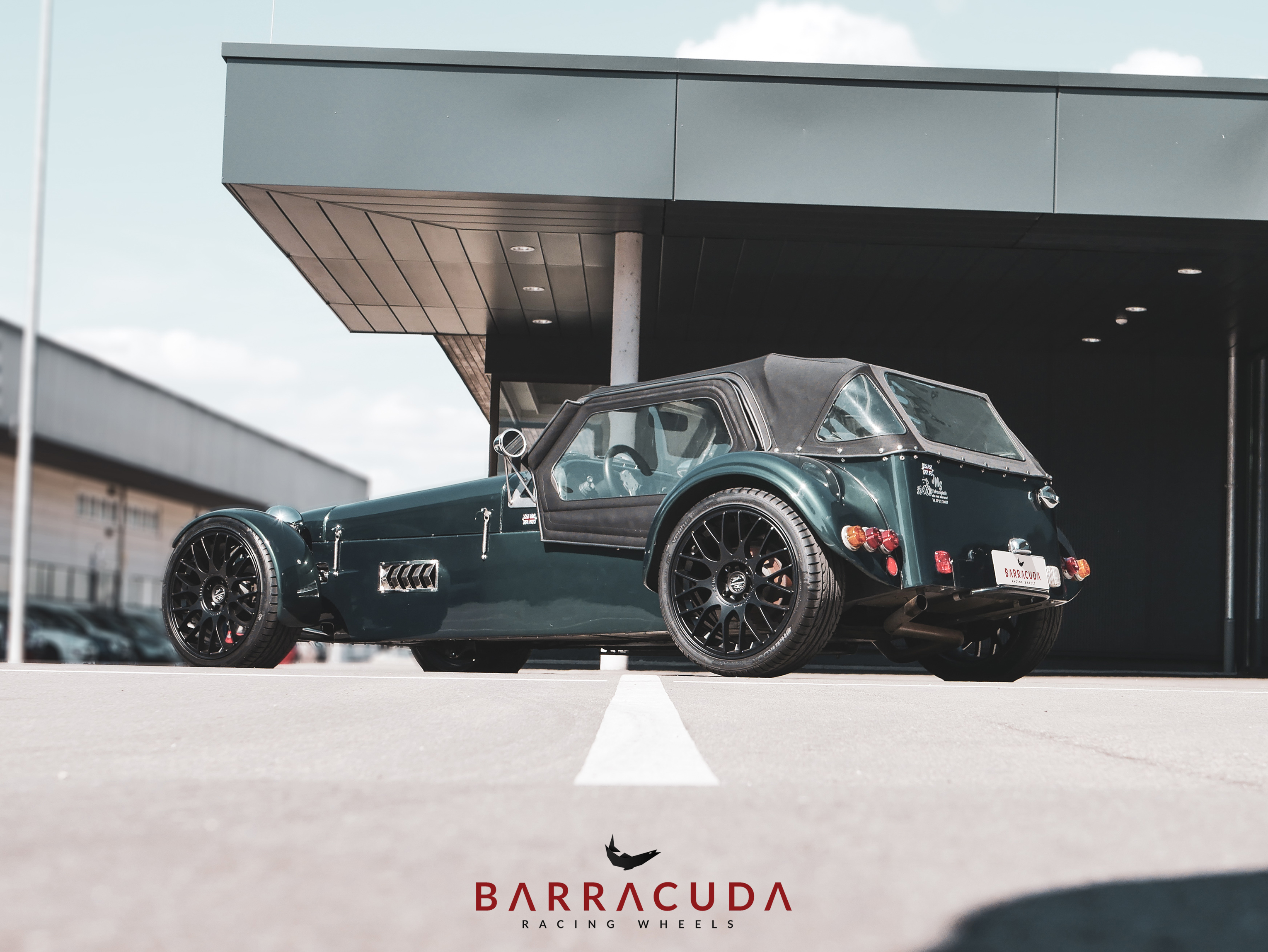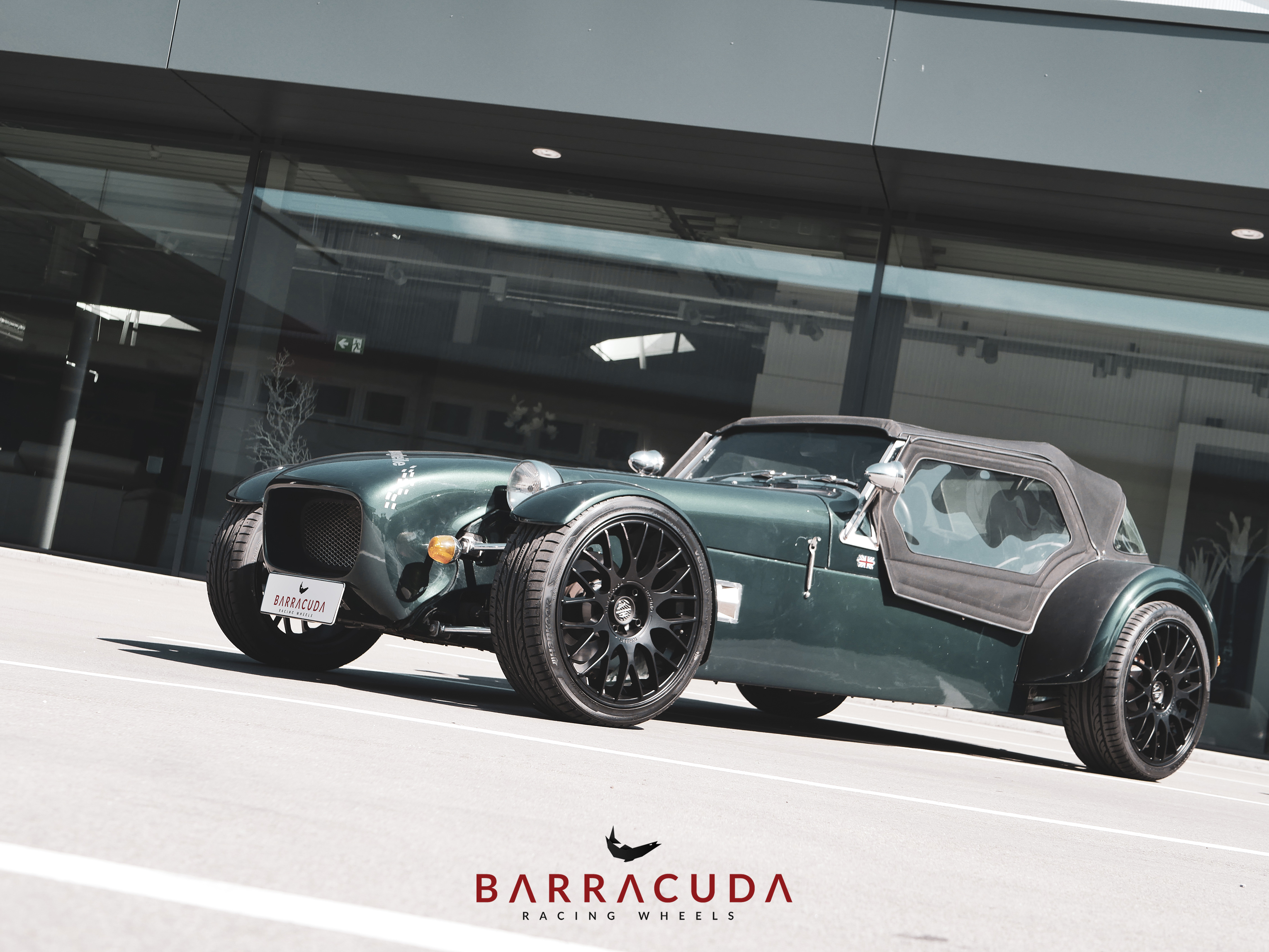 (lifepr) (Walddorfhäslach, 12.10.2018) The Lotus Seven stands for one of the most puristic and uncompromising sports car concepts ever. This roadster with free-standing wheels in front weighs in at a mere 750 kilograms. The British firm made the cars from 1957 to 1972. However, the model did not then die out entirely. Caterham was granted official production rights and has continued to build the Seven right up to the present day. Other manufacturers also make replicas, or have made them in the past, that adhere to the same concept, such as the 77, which VM built until 2010. One such specimen has now been equipped with a set of Barracuda Racing Wheels.