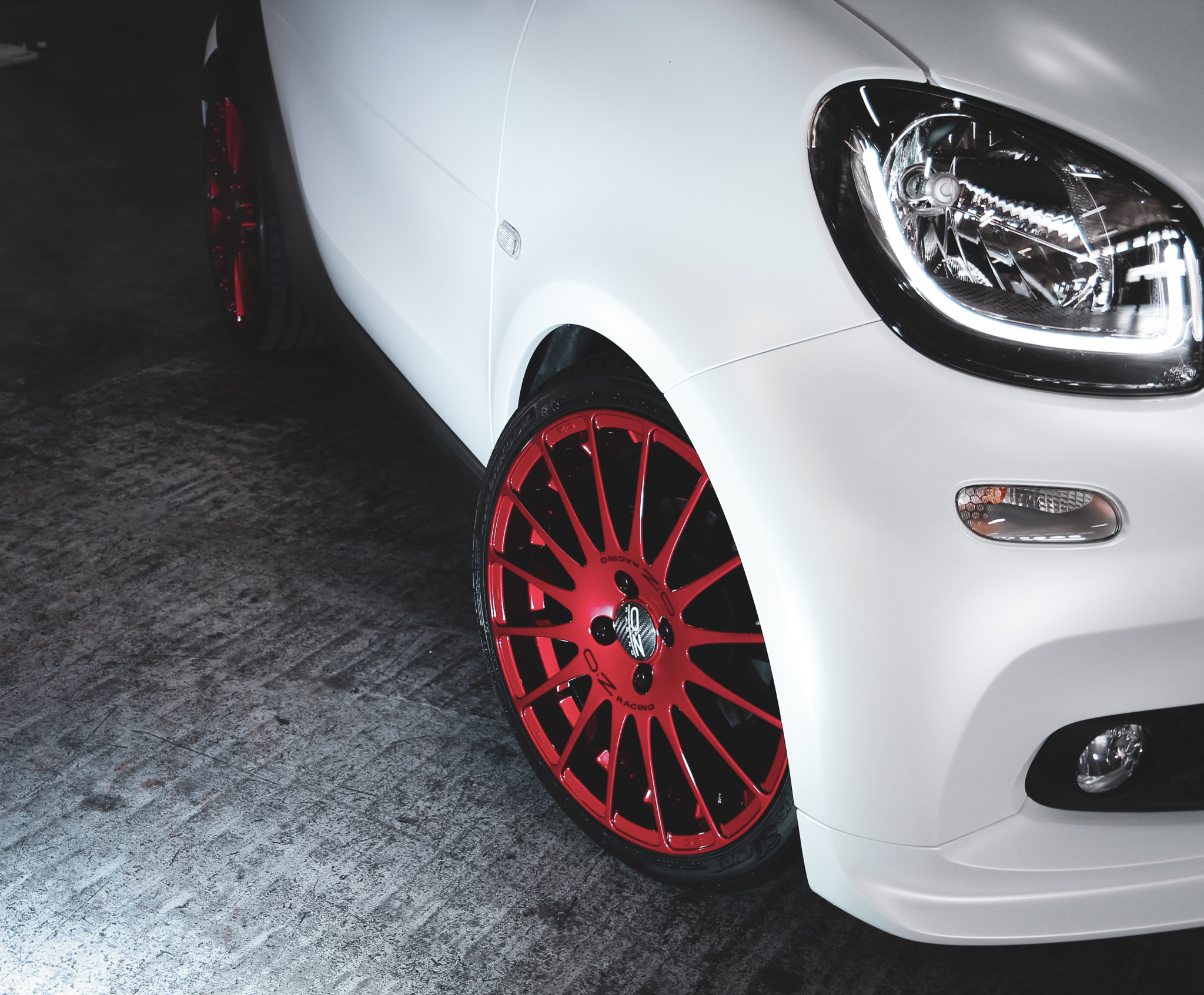 They fitted the 453 model of the current generation with a set of 7x17” OZ Superturismo GT light metal alloy wheels. The multi-spoke rims really stand out against the simple white and silver paint of the vehicle with their individual JMS flash color red finish, making them true eyecatchers. Other highlights include the carbon hubcaps. The Hankook Ventus S1 Evo tires measure 205/40R17.