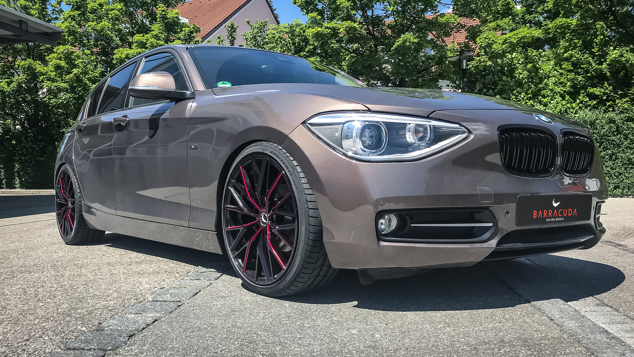 (lifepr) (Walddorfhäslach, 30.07.2019) Seit einigen Monaten bieten die Spezialisten von Barracuda Racing Wheels neben den Standard-Finishes für ihre Räder auch die sogenannten Flash Colours an. Sie basieren auf Felgen mit dunkler Grundfarbe und verfügen zusätzlich über farbige Akzente. Dabei werden die Flash Colours mittlerweile immer beliebter bei den Kunden. So wurde nun beispielsweise dieser BMW 1er, ein Vor-Facelift-Modell der noch aktuellen zweiten Modellgeneration mit einem Satz farbig veredelter Räder ausgerüstet.